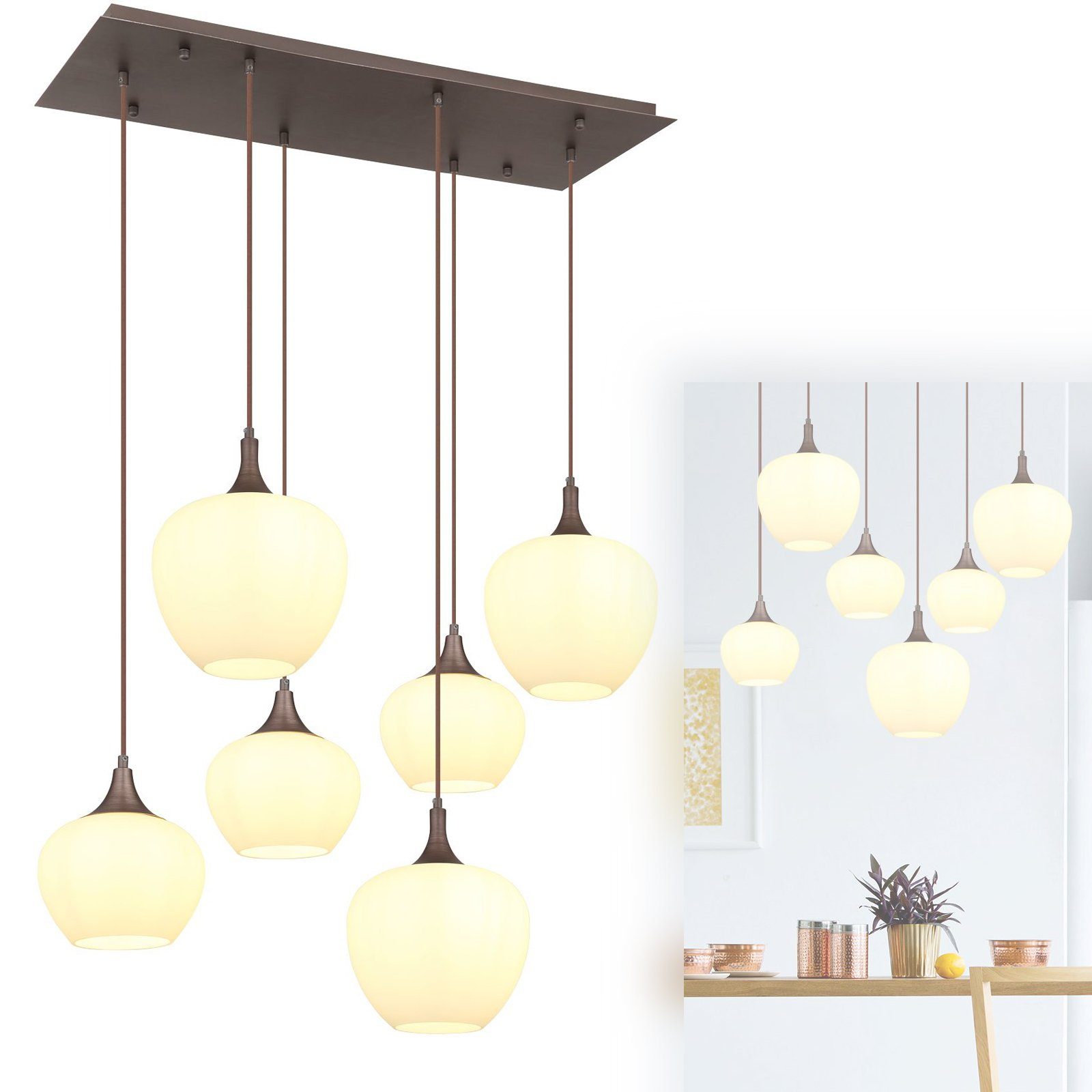 Wissenswertes | HÄNGELEUCHTE - DESIGN – 6-FLAMMIG Entdecken Sie diese elegante Hängeleuchte und verleihen Sie Ihrem Raum einen Hauch von zeitloser Schönheit. Diese atemberaubende Metallleuchte in kaffeefarbenem Finish und opalem Glas kombiniert Ästhetik mit Funktionalität. Mit den zwei verschiedenen Glasgrößen, jeweils 3x 18 cm und 24 cm im Durchmesser, sorgt die Hängeleuchte für ein faszinierendes Lichtspiel. Das schwarze Textilkabel verleiht der Leuchte eine moderne Note. Mit den Abmessungen von LxBxH: 860x420x1200 mm wird die Hängeleuchte zum beeindruckenden Blickfang in jedem Raum. Die E27 Fassungen ermöglichen Ihnen bis zu einer maximalen Leistung von 40 Watt, selbst über Lichtfarbe und Helligkeit zu bestimmen. Bringen Sie mit dieser Hängeleuchte Stil und Eleganz in Ihre Räume und lassen Sie Ihre Einrichtung erstrahlen. |