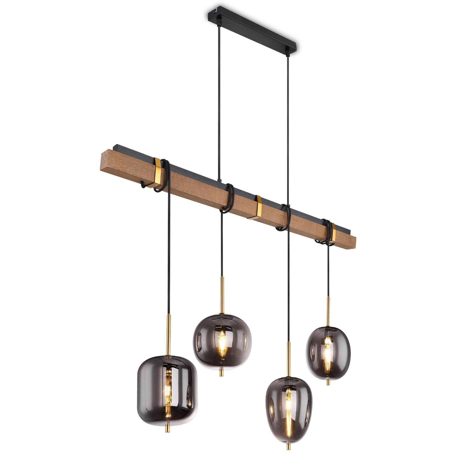 Die Hängelampe kombiniert ein ästhetisches Design mit funktionaler Eleganz und eignet sich perfekt für die Innenraumgestaltung. Sie besteht aus einem braunen Holzstab mit Metallelementen in Altmessingoptik, der an zwei Kabeln von der Decke hängt. An diesen Kabeln sind vier rauchige Gläser unterschiedlicher Form befestigt, die ein angenehm diffuses Licht erzeugen.
