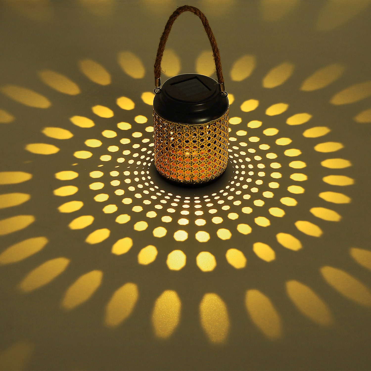 Eine tolle Gartenleuchte. Die zahlreichen Kreise im Metall werden durch das angenehm warmweiße Licht von 3000 Kelvin der solarbetriebenen LED-Leuchtmittel wunderschön auf den Boden oder die Wand projiziert.