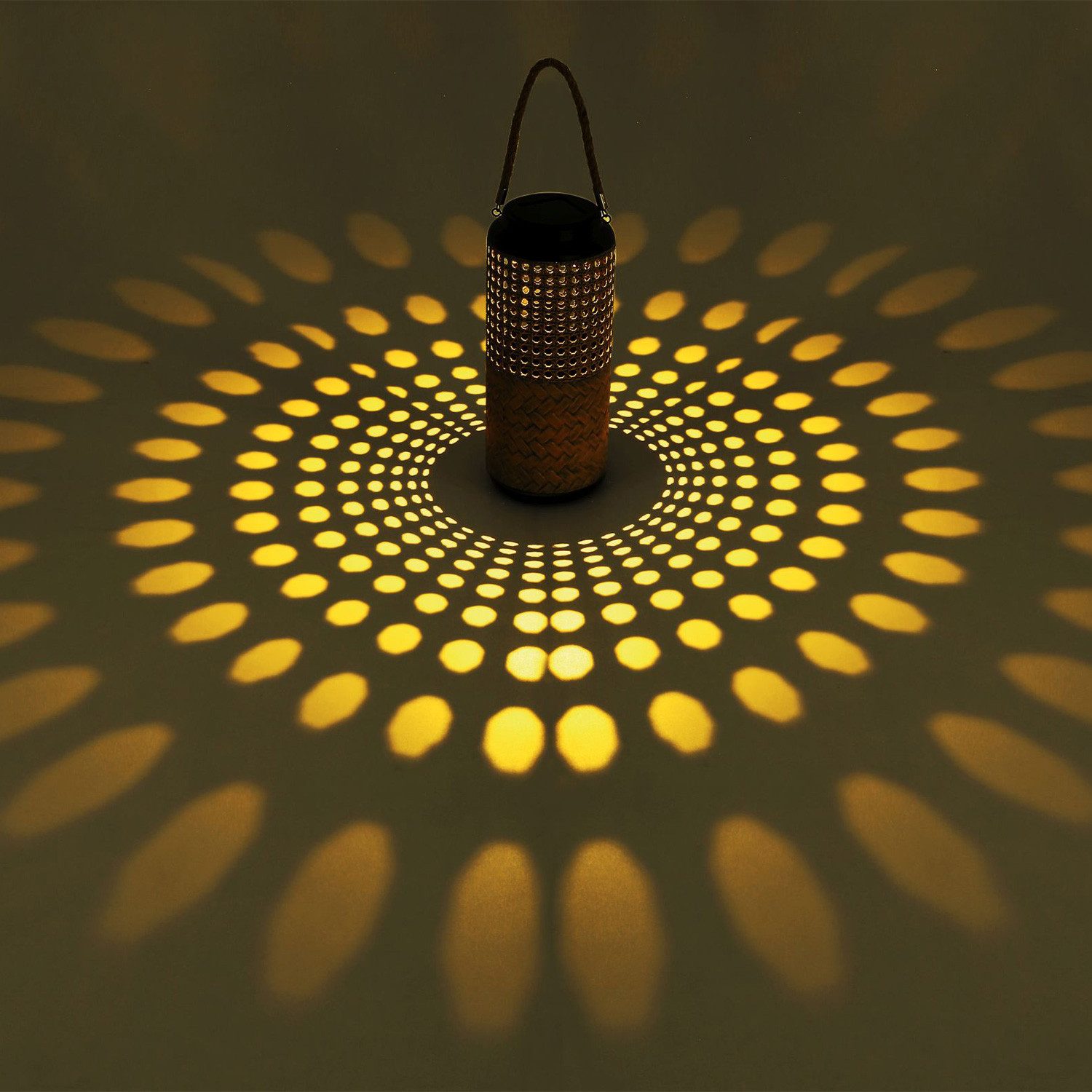 Die zahlreichen Kreise in den metallenen Seiten werden vom solarbetriebenen LED-Leuchtmittel wunderbar nach außen projiziert.