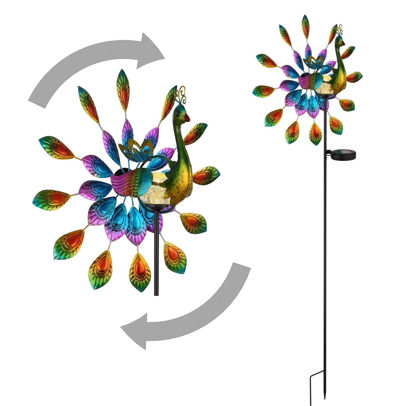 Die bunte Solarleuchte bringt mit ihrem beeindruckenden Pfau-Design Farbe in Ihren Garten. Diese einzigartige Solarleuchte besteht aus einem schwarzen, matten Metallkorpus und farbenfrohen Metallakzenten am Schirm, die den Pfau kunstvoll in Szene setzen.