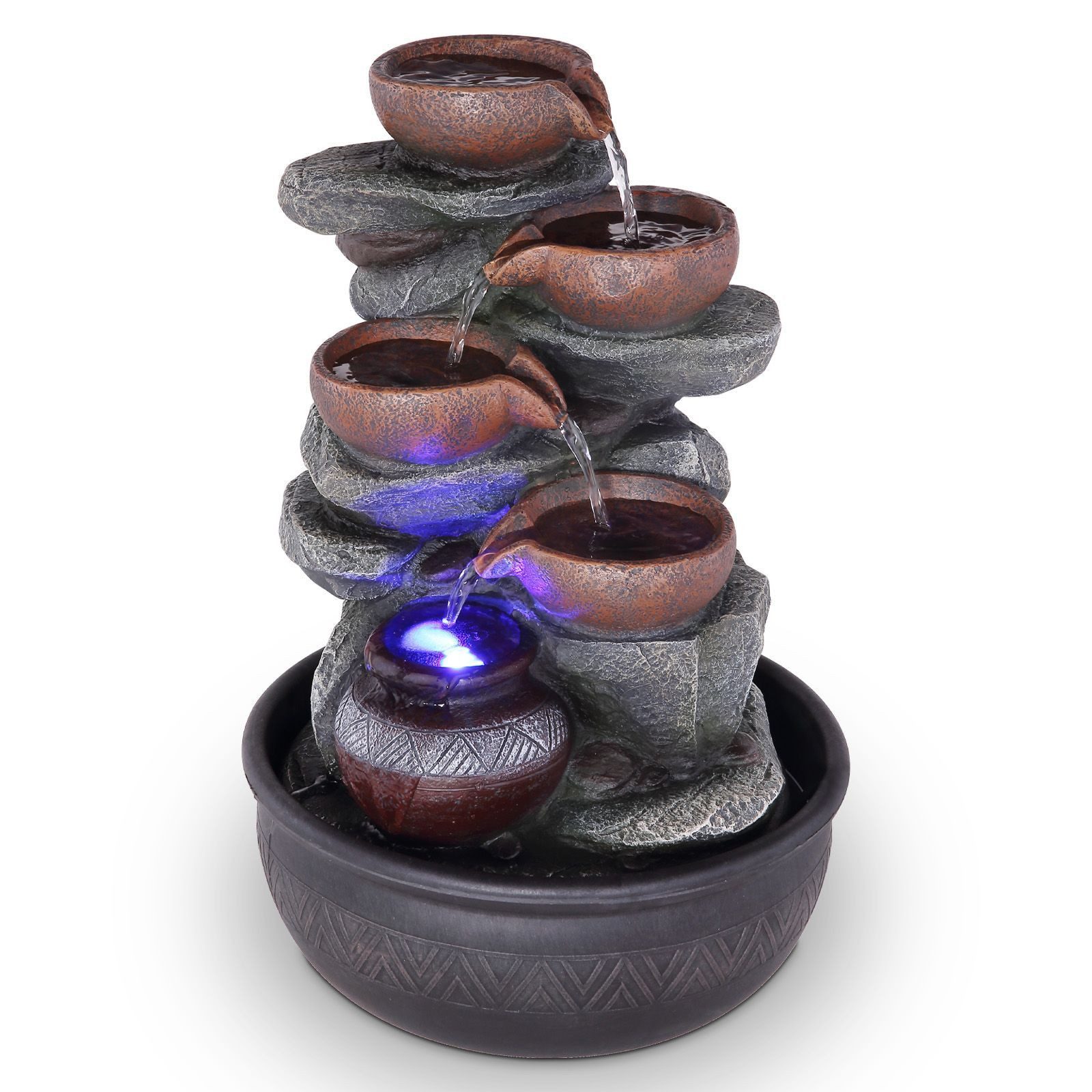 Dieser Tischbrunnen (knapp 40cm hoch) mit dem Brunnen Motiv könnte zum Mittelpunkt in Ihrem Bereich werden. Der schwarze und graufärbige aus Kunststoff bestehende Zimmerbrunnen hat eine inkludierte Pumpe und bietet mit dem eingebauten LED Leuchtmittel das passende Licht, welches sich auch farblich verändern lässt. In der gleichen Produktserie finden Sie weitere Brunnen dieser Art.