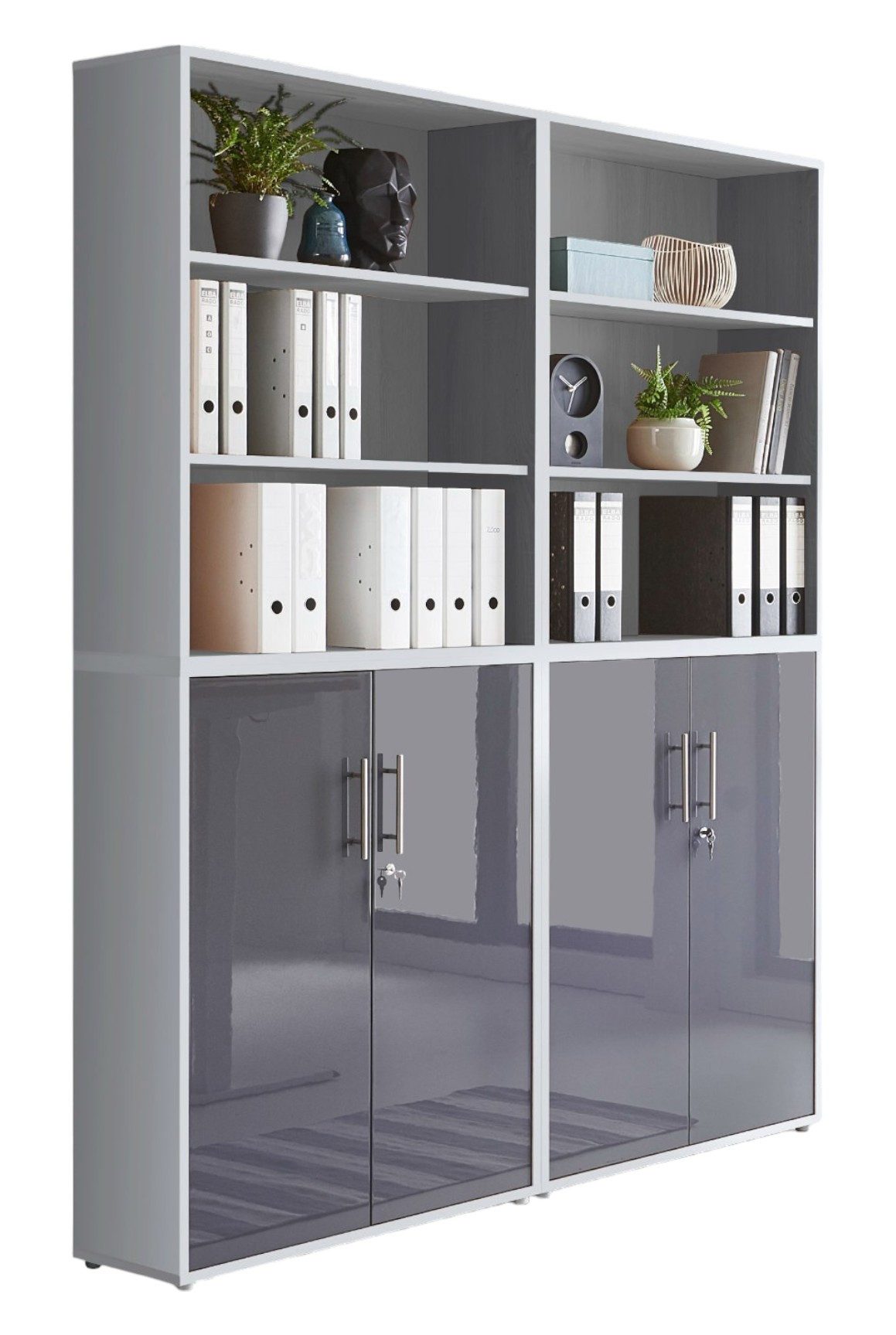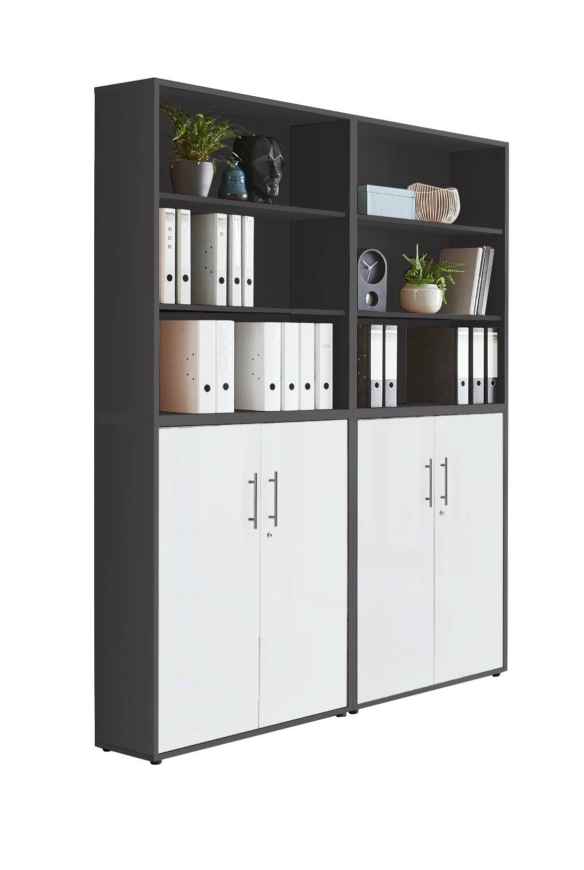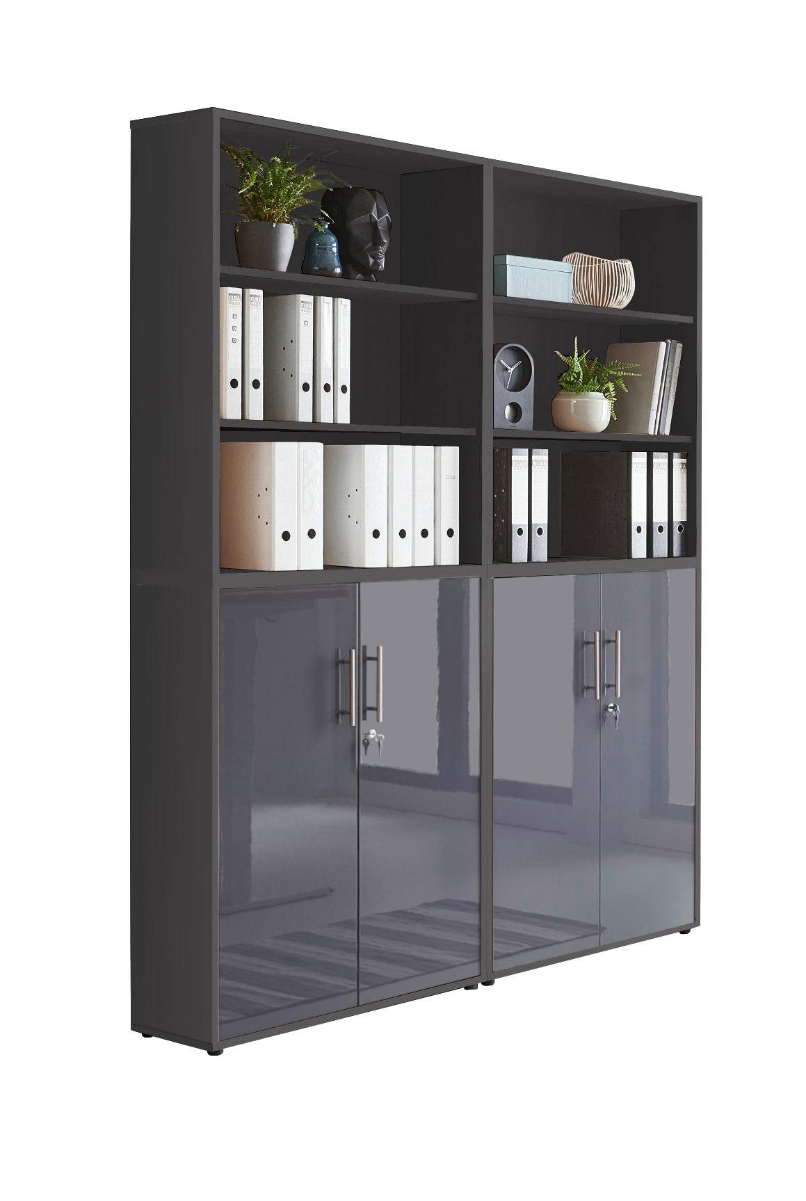 Wissenswertes | BMG Möbel Schrankwand Office Edition 11 in verschiedenen Farben erhältlich Set beinhaltet: 2 Aktenschränke breit / niedrig mit je 2 abschließbaren Türen mit je 1 verstellbarem Einlegeboden und 1 Konstruktionsboden Maße montiert B/H/T: jeweils ca. 84,4 x 113,6 x 33 cm 2 Aktenregale breit / niedrig als Aufsatz montierbar mit je 1 verstellbarem Einlegeboden und 1 Konstruktionsboden Maße montiert B/H/T: jeweils ca. 84,4 x 113,6 x 33 cm Gesamtmaß mit Aufsatz B/H/T: ca. 168,8 x 227,2 x 33 cm Zusätzliche Informationen: Griffe Edelstahl alle Türen abschließbar ABS Kanten Dekoration nicht im Lieferumfang enthalten |