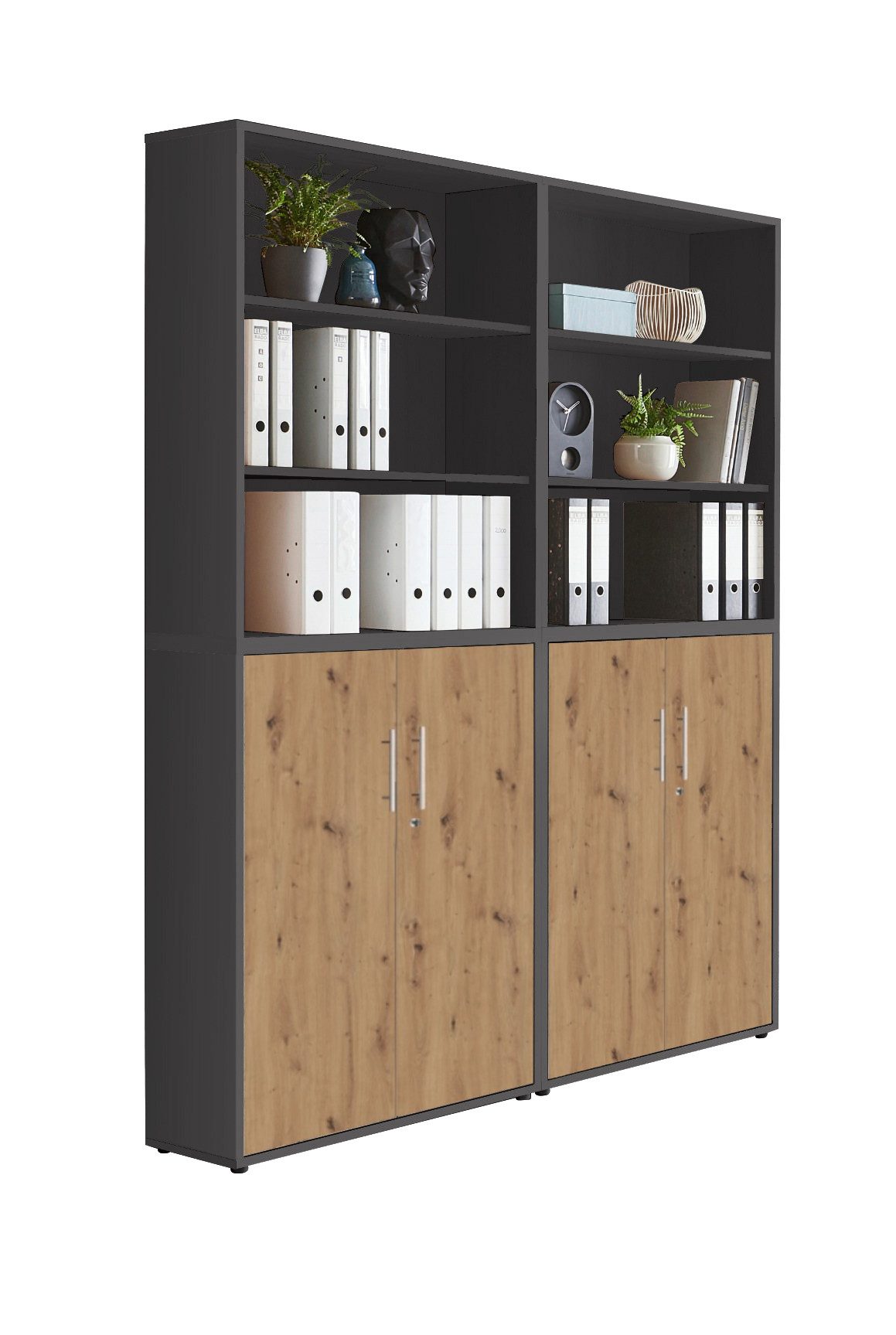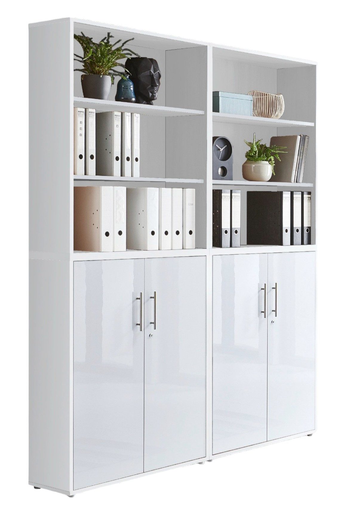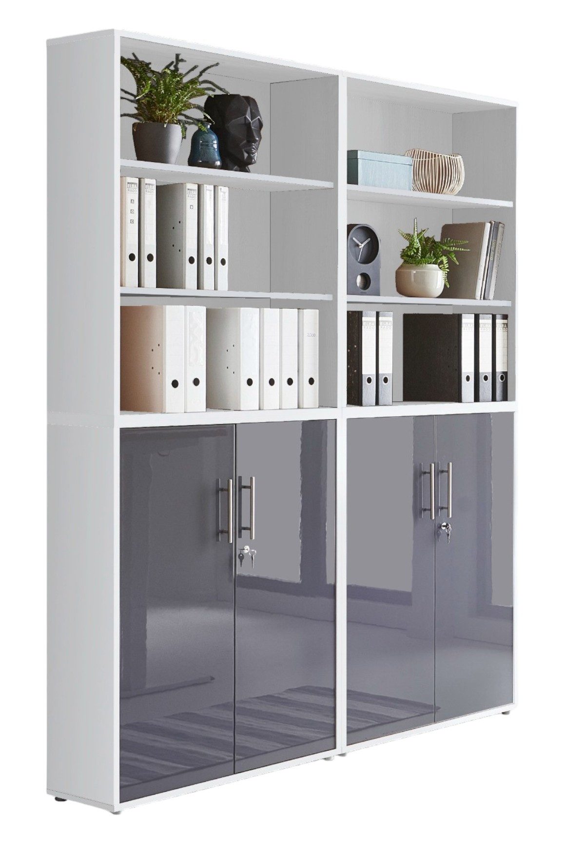 Wissenswertes | BMG Möbel Schrankwand Office Edition 11 in verschiedenen Farben erhältlich Set beinhaltet: 2 Aktenschränke breit / niedrig mit je 2 abschließbaren Türen mit je 1 verstellbarem Einlegeboden und 1 Konstruktionsboden Maße montiert B/H/T: jeweils ca. 84,4 x 113,6 x 33 cm 2 Aktenregale breit / niedrig als Aufsatz montierbar mit je 1 verstellbarem Einlegeboden und 1 Konstruktionsboden Maße montiert B/H/T: jeweils ca. 84,4 x 113,6 x 33 cm Gesamtmaß mit Aufsatz B/H/T: ca. 168,8 x 227,2 x 33 cm Zusätzliche Informationen: Griffe Edelstahl alle Türen abschließbar ABS Kanten Dekoration nicht im Lieferumfang enthalten |