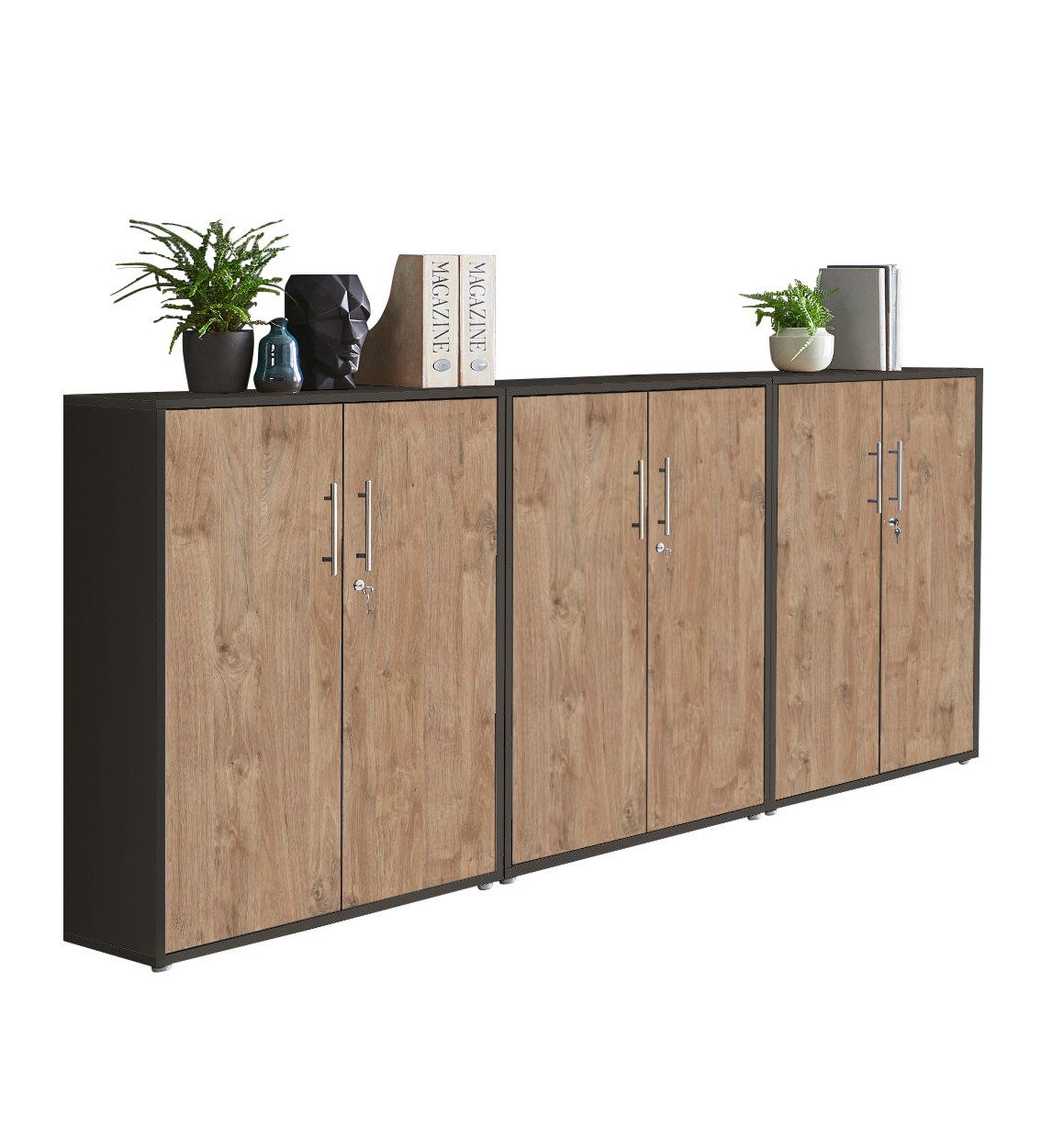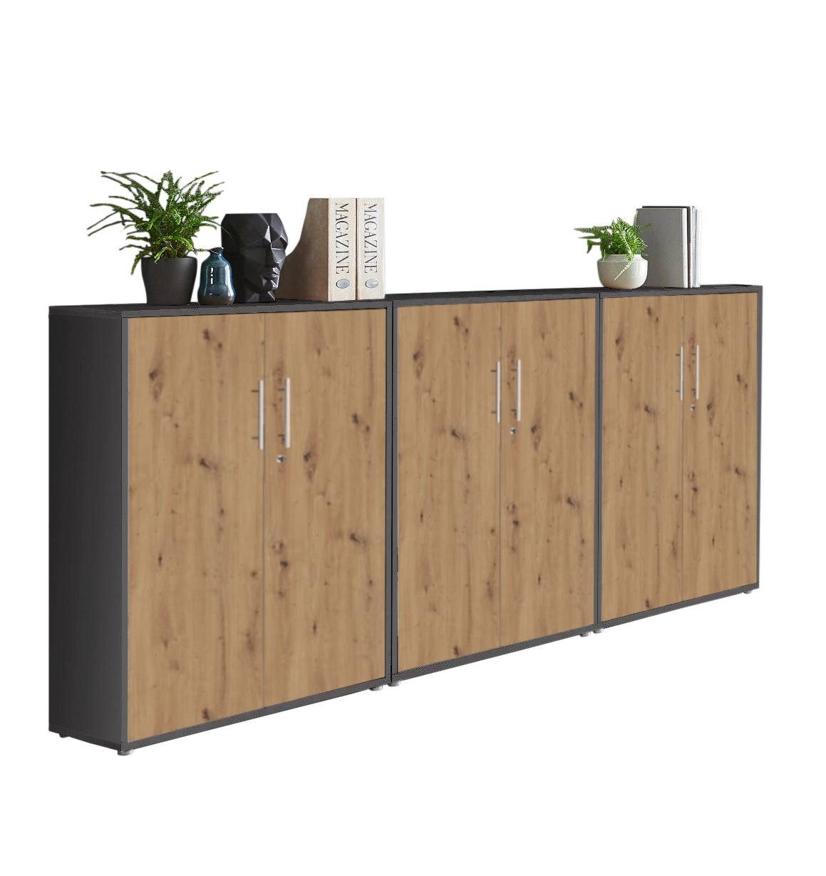 Die Dekoration ist nicht im Lieferumfang enthalten. Für Sicherheit und Langlebigkeit sorgen abschließbare Türen, robuste Edelstahlgriffe, hochwertige Metallscharniere sowie stoßfeste ABS-Kanten. Jeder Schrank ist mit einem verstellbaren Einlegeboden und einem Konstruktionsboden ausgestattet, sodass Sie die Fächer individuell anpassen können. Die Schrankwand überzeugt durch ihre Qualität Made in Germany und ist in 15 modernen Farbkombinationen erhältlich – von klassischem Weiß bis hin zu trendigem Gold Harbor Oak. So lässt sich die Büroeinrichtung perfekt an Ihren Stil anpassen. Erhältliche Farbvarianten:
