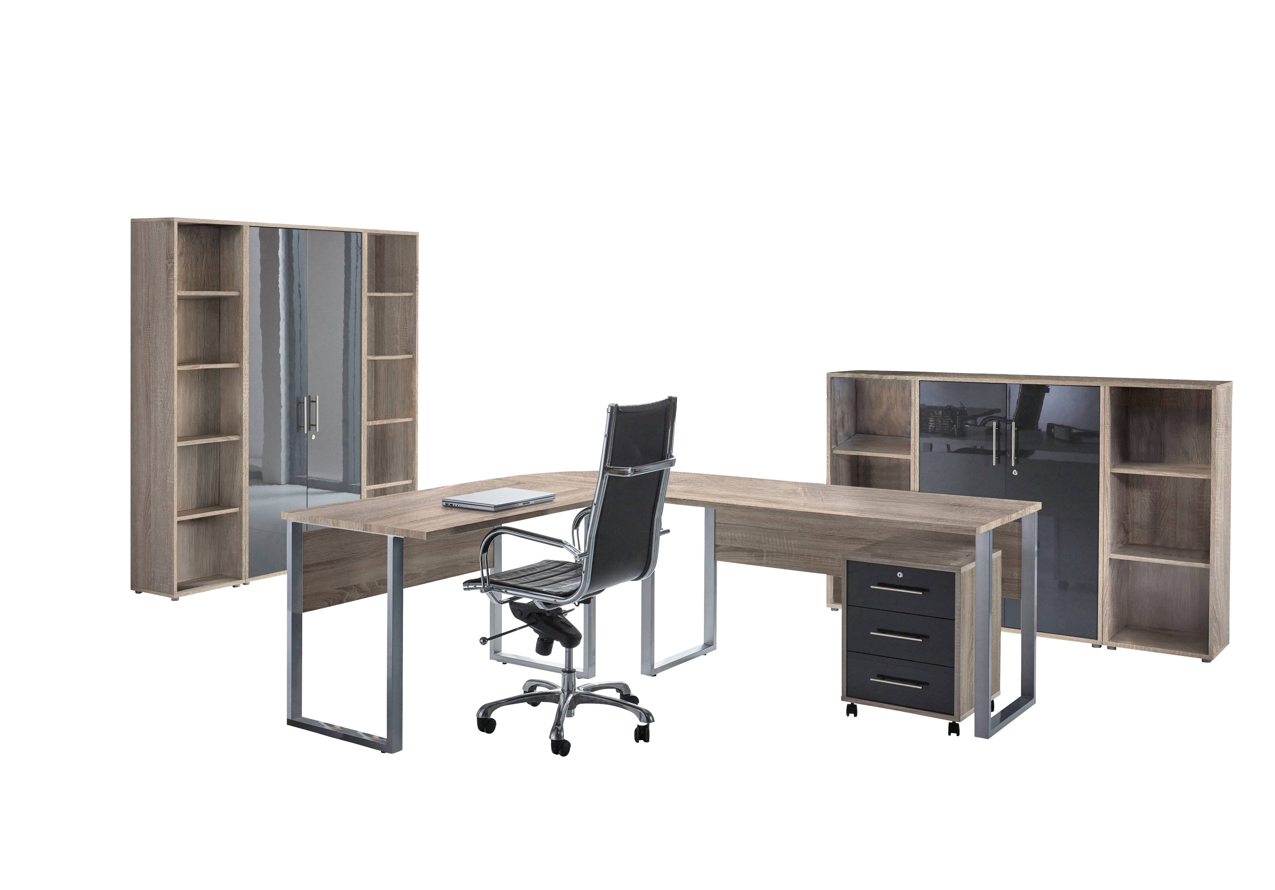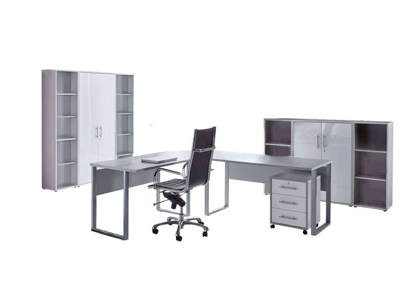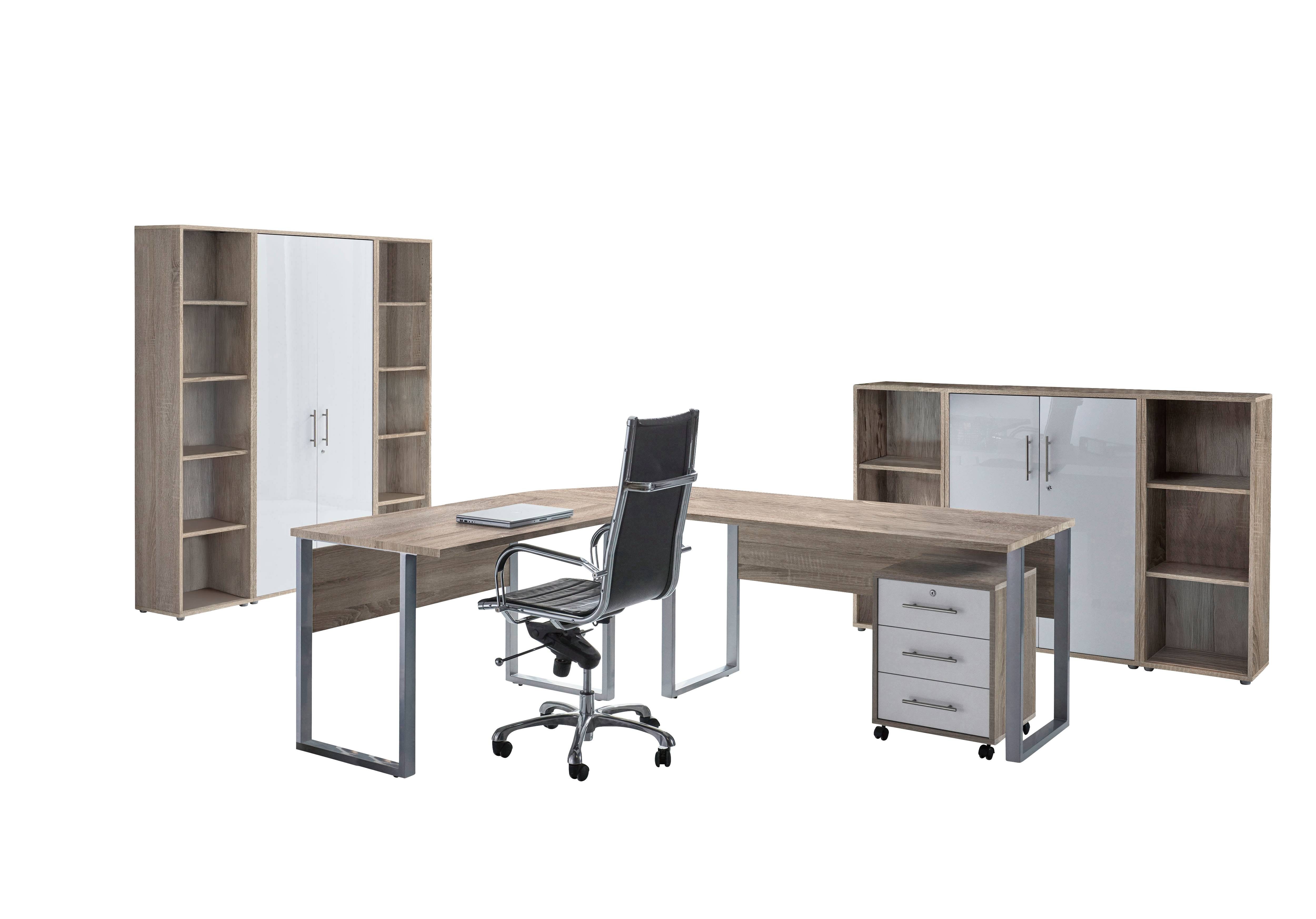 Lieferumfang | Winkelschreibtisch, Rollcontainer, 2x niedriges Regal, 2x hohes Regal, 1x hoher Aktenschrank, 1x niedriger Aktenschrank |
