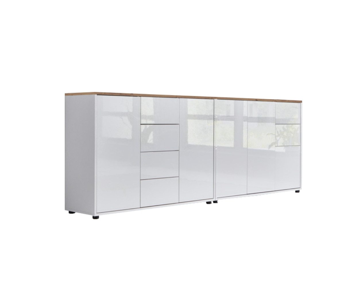 Farbe | Weiß, Weiß Hochglanz mit Oberboden in Artisan Eiche |