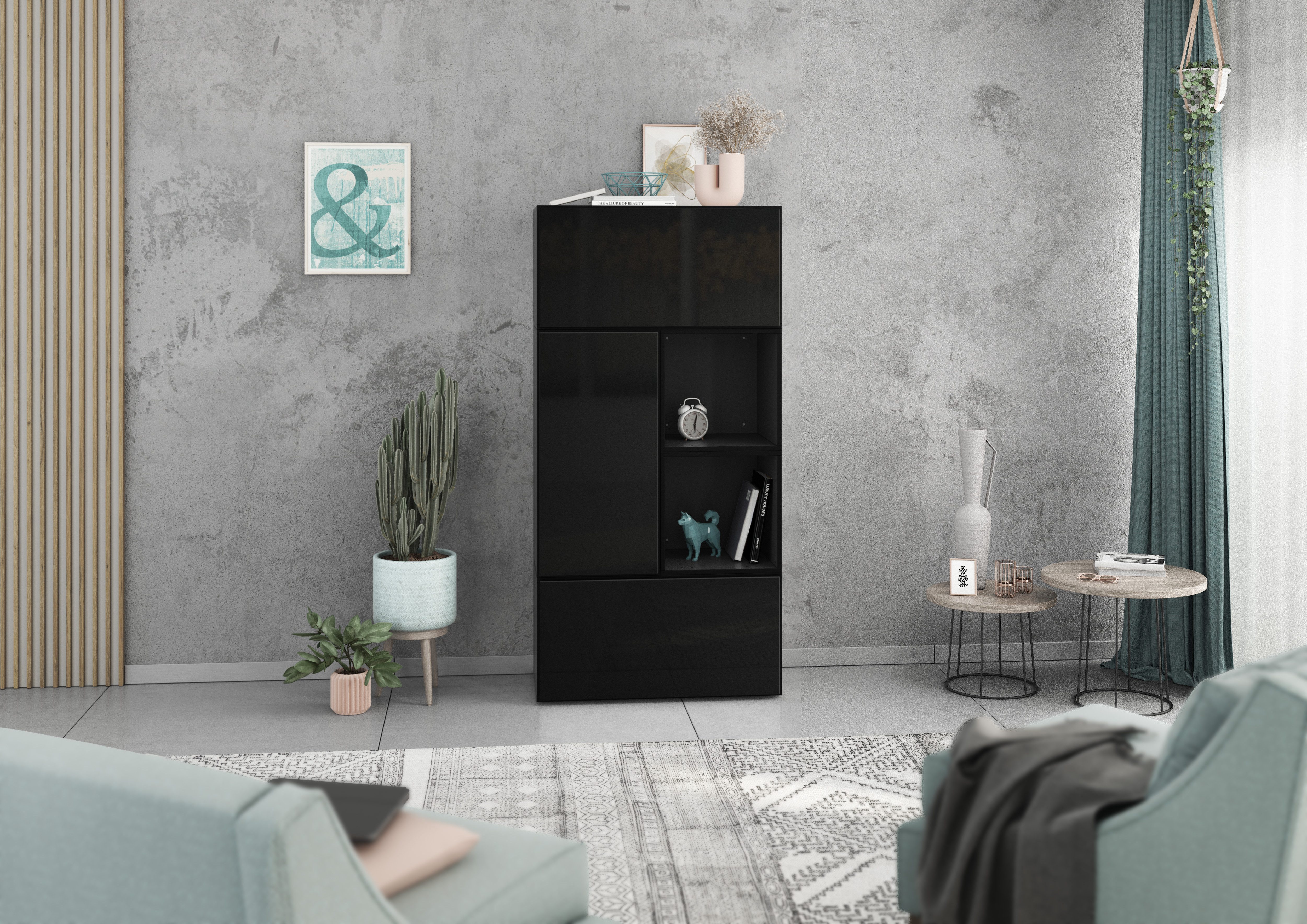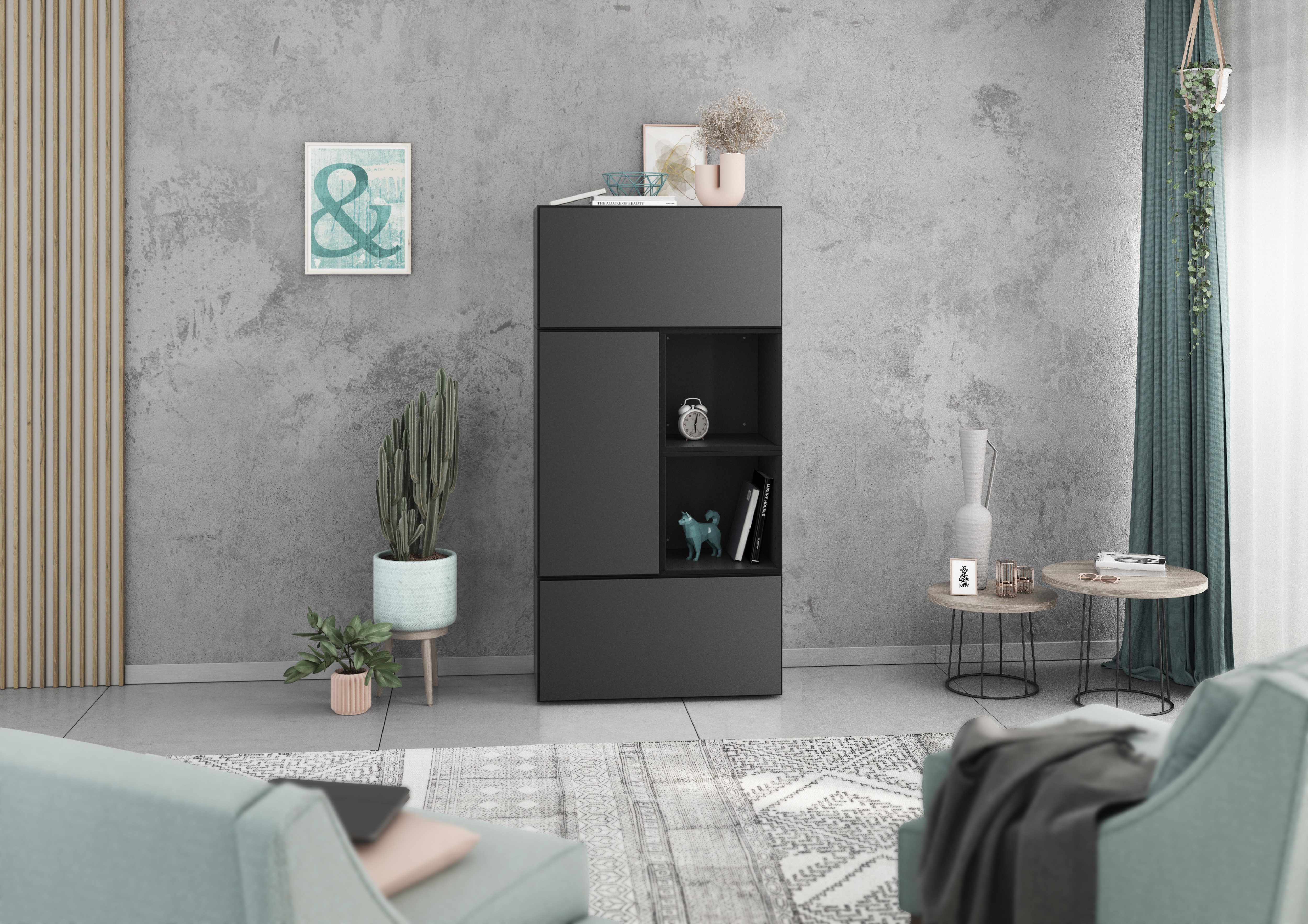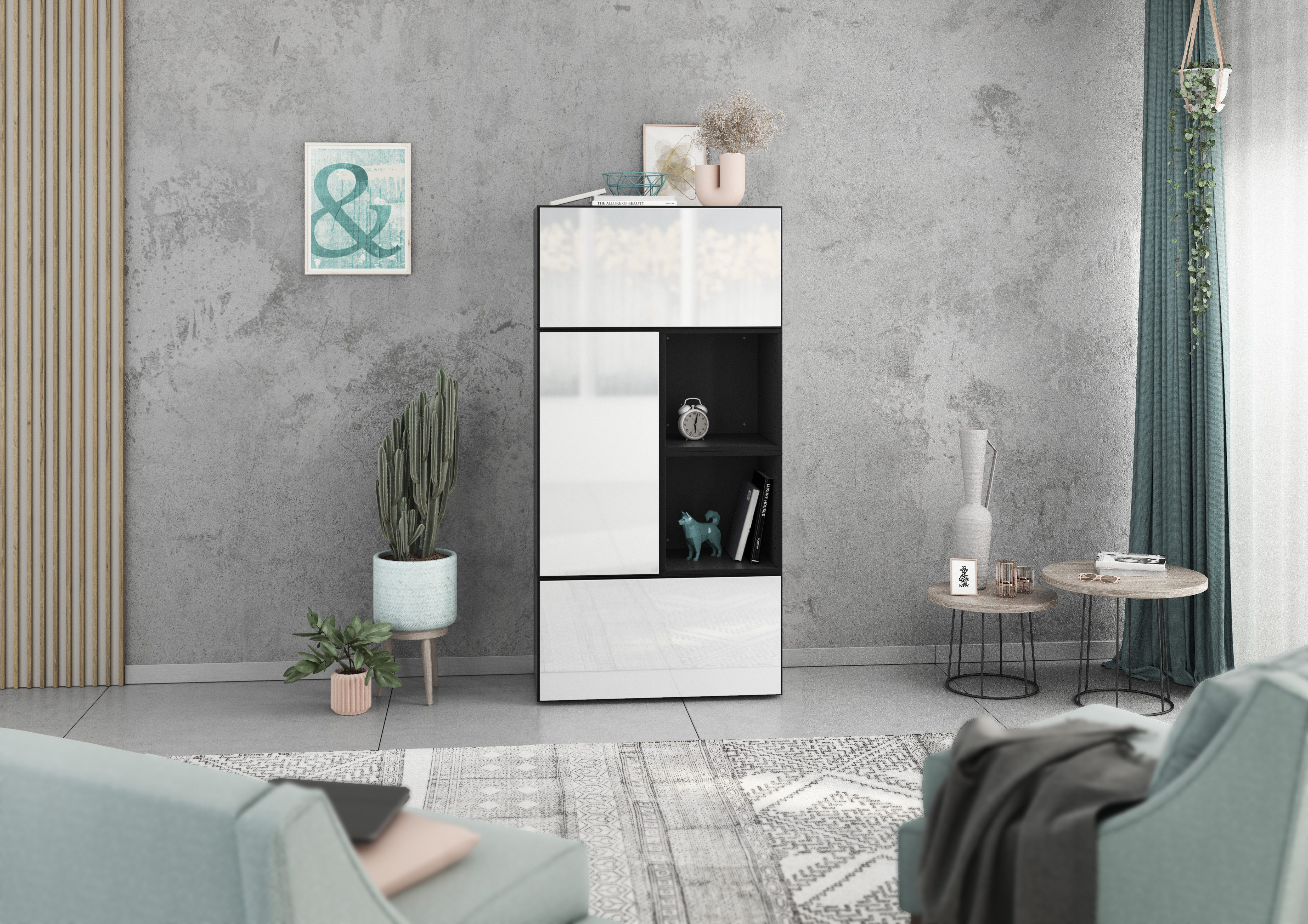 Lieferumfang | 2x Schrank mit Klappenfunktion 1x Schrank mit Tür 2x Regal Bohrschablone Montageanleitungen Wahlweise Metallfüße |