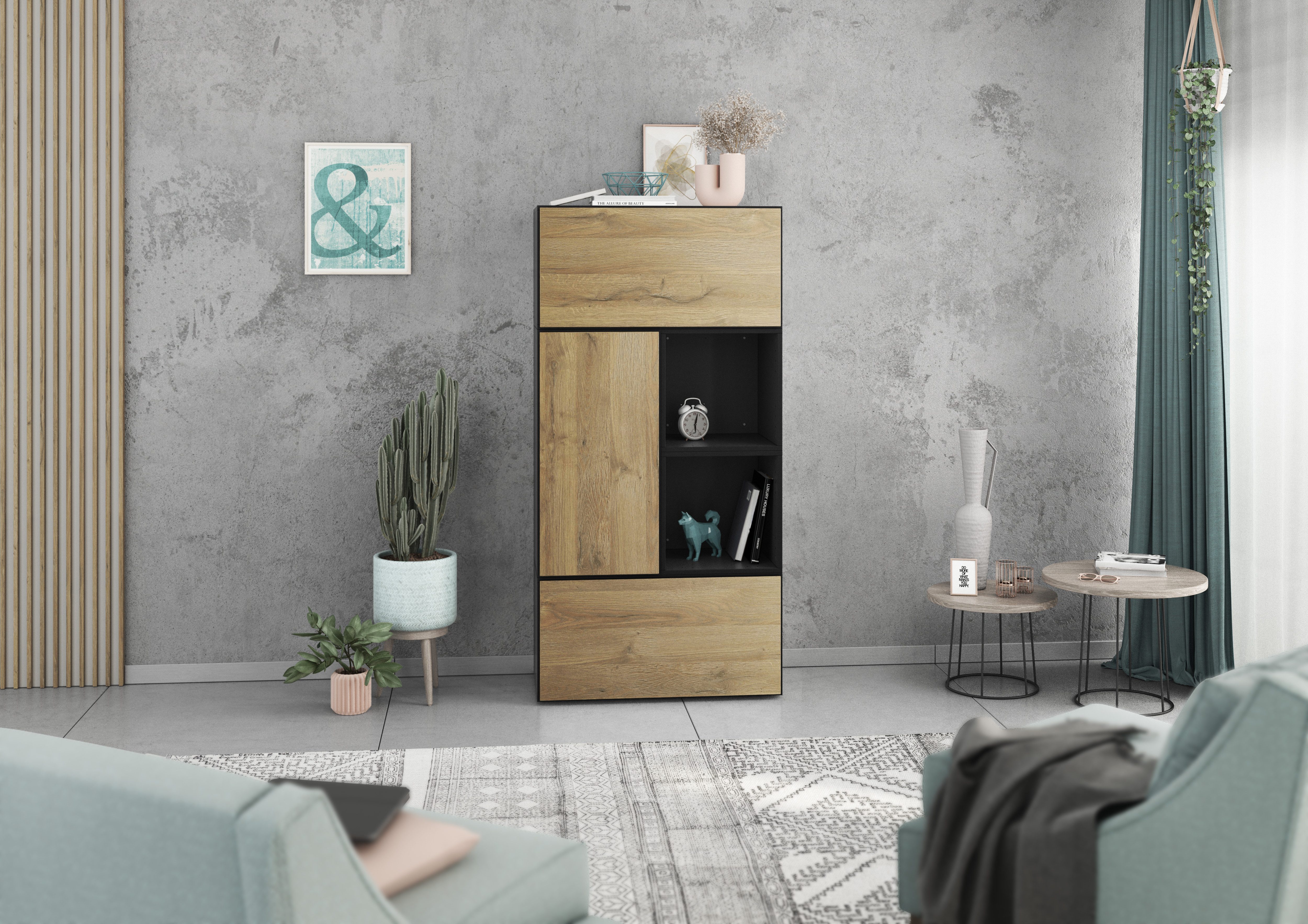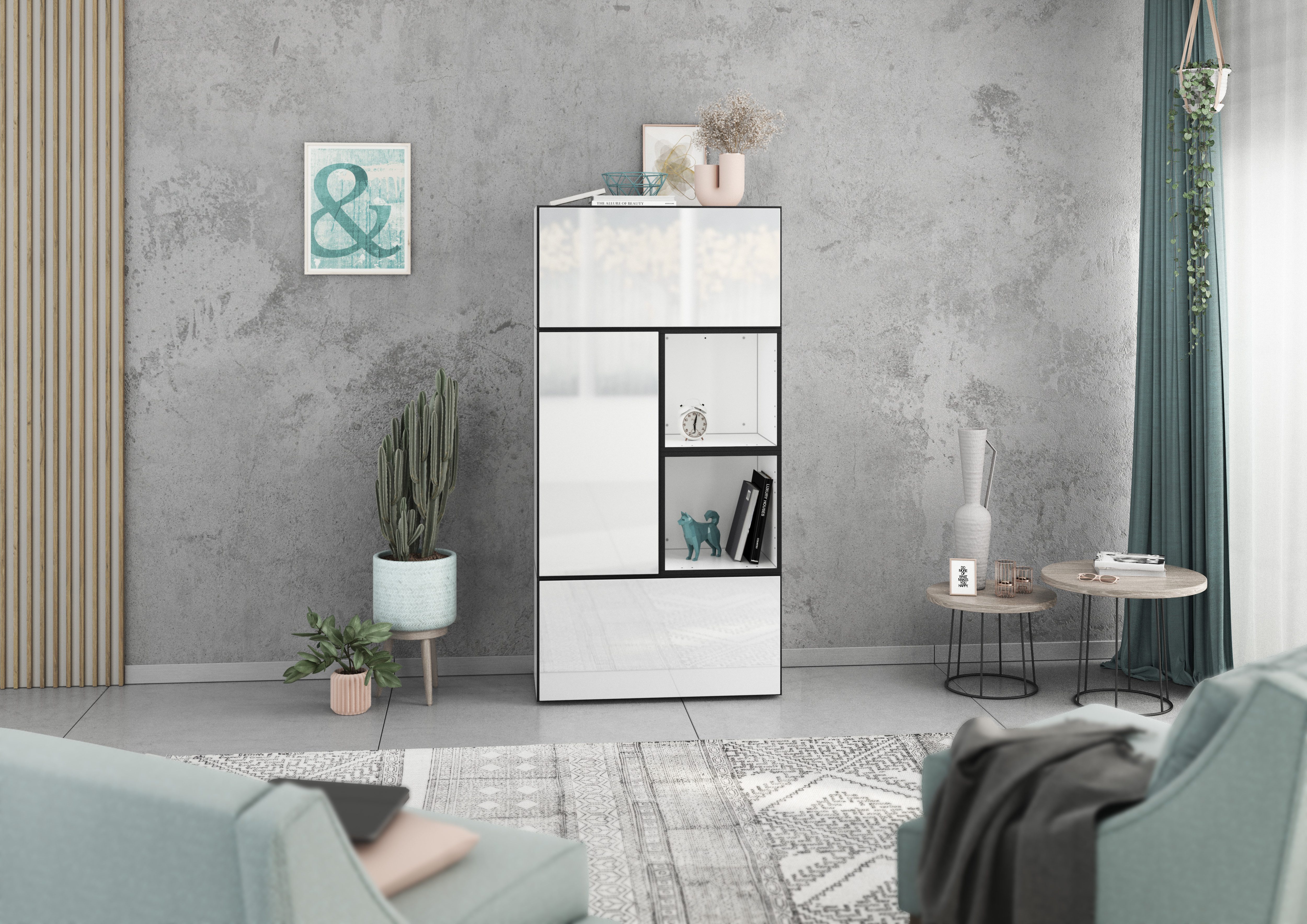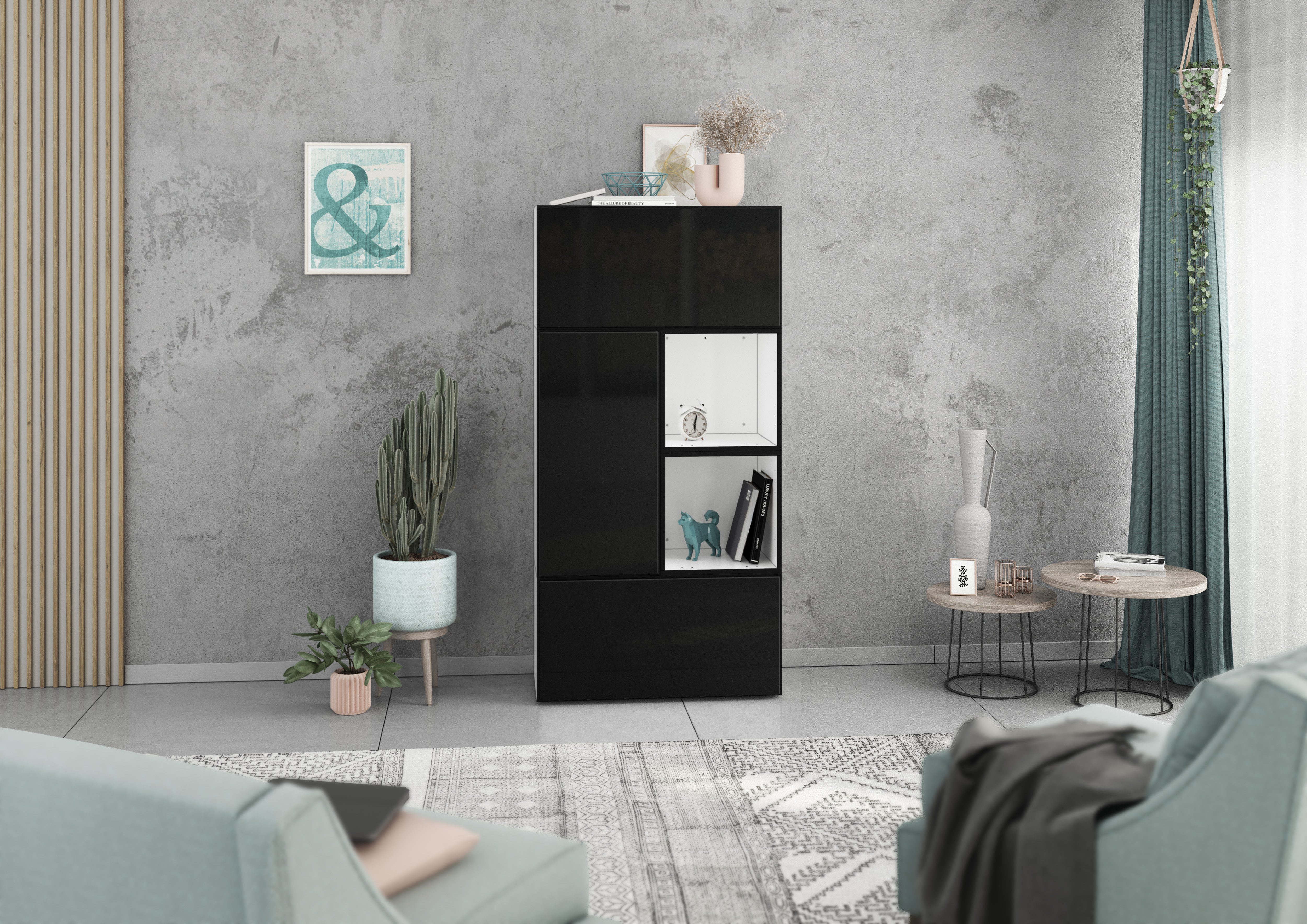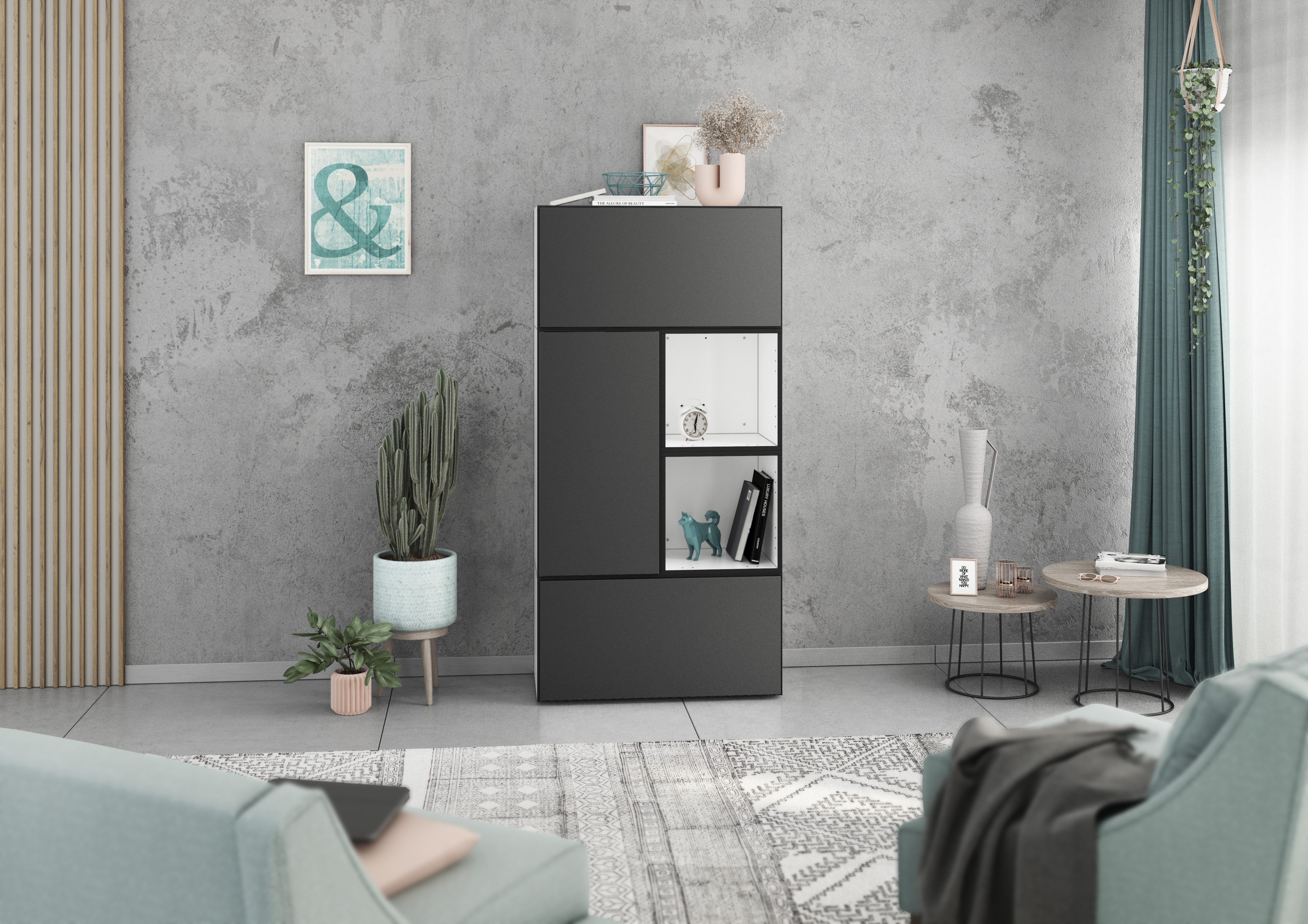 Lieferumfang | 2x Schrank mit Klappenfunktion 1x Schrank mit Tür 2x Regal Bohrschablone Montageanleitungen Wahlweise Metallfüße |