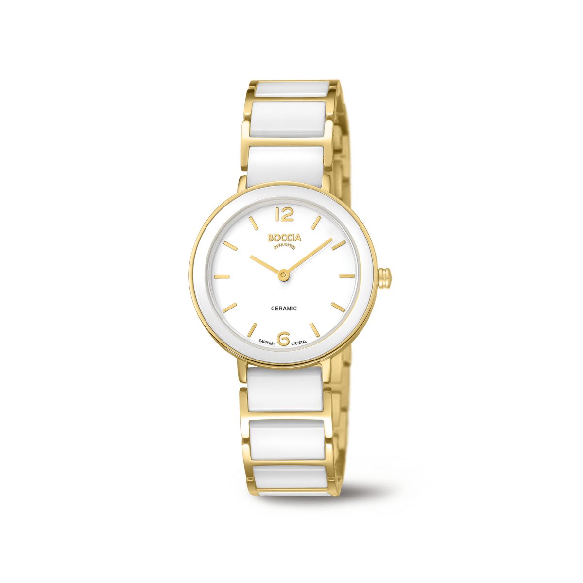 Ein echter Blickfang bei dieser schönen Boccia Damenarmbanduhr ist elegante Einarbeitung der Keramikelemente. Die Boccia Damen Uhr ist eine analoge Quarzuhr, das Zifferblatt hat Indexe, wobei die arabische Zahl auf der 12 Uhr und 6 Uhr Position eine Ausnahme darstellt. Die edle Damenuhr ist aus Keramik und Reintitan gefertigt, hat ein kratzfestes Saphirglas und ist bis zu 5 ATM wasserdicht. Sie können dieses Modell von Boccia ohne Bedenken zu jedem Anlass tragen.