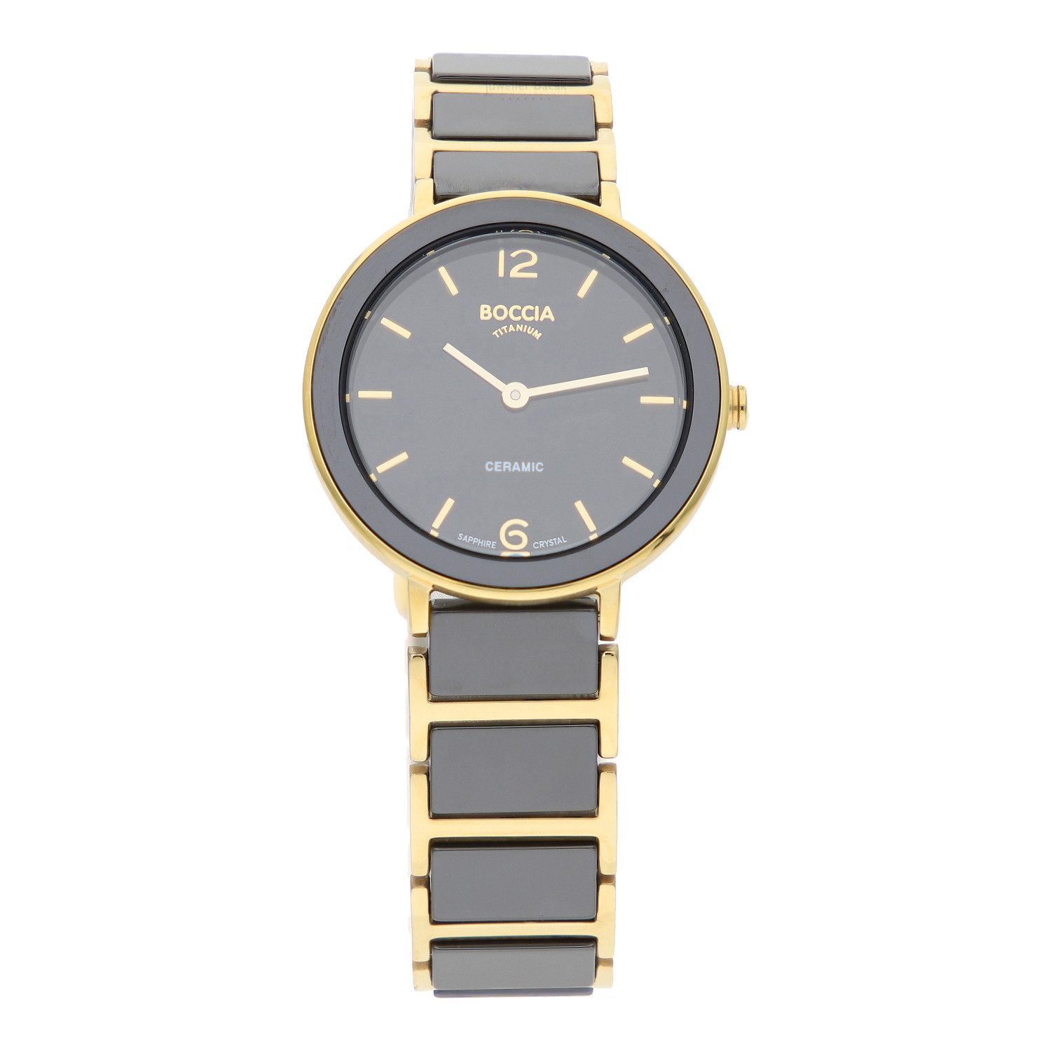 Diese elegante Damenuhr von Boccia ist der Ideale Tägliche Begleiter. Mit Ihrem zeitlosen Look bietet sich diese Uhr für jeden als sichere schlichte, aber dennoch elegante Option an. Das Gehäuse sowie das Armband bestehen vollständig aus Titanium mit Keramikelementen, welches die Uhr umso leichter und hautfreundlicher macht. Das einfach lesbare Ziffernblatt ist perfekt durch ein besonders wiederstandsfähiges Saphirglas geschützt. Noch dazu ist diese Uhr bis zu 5 ATM wasserfest.