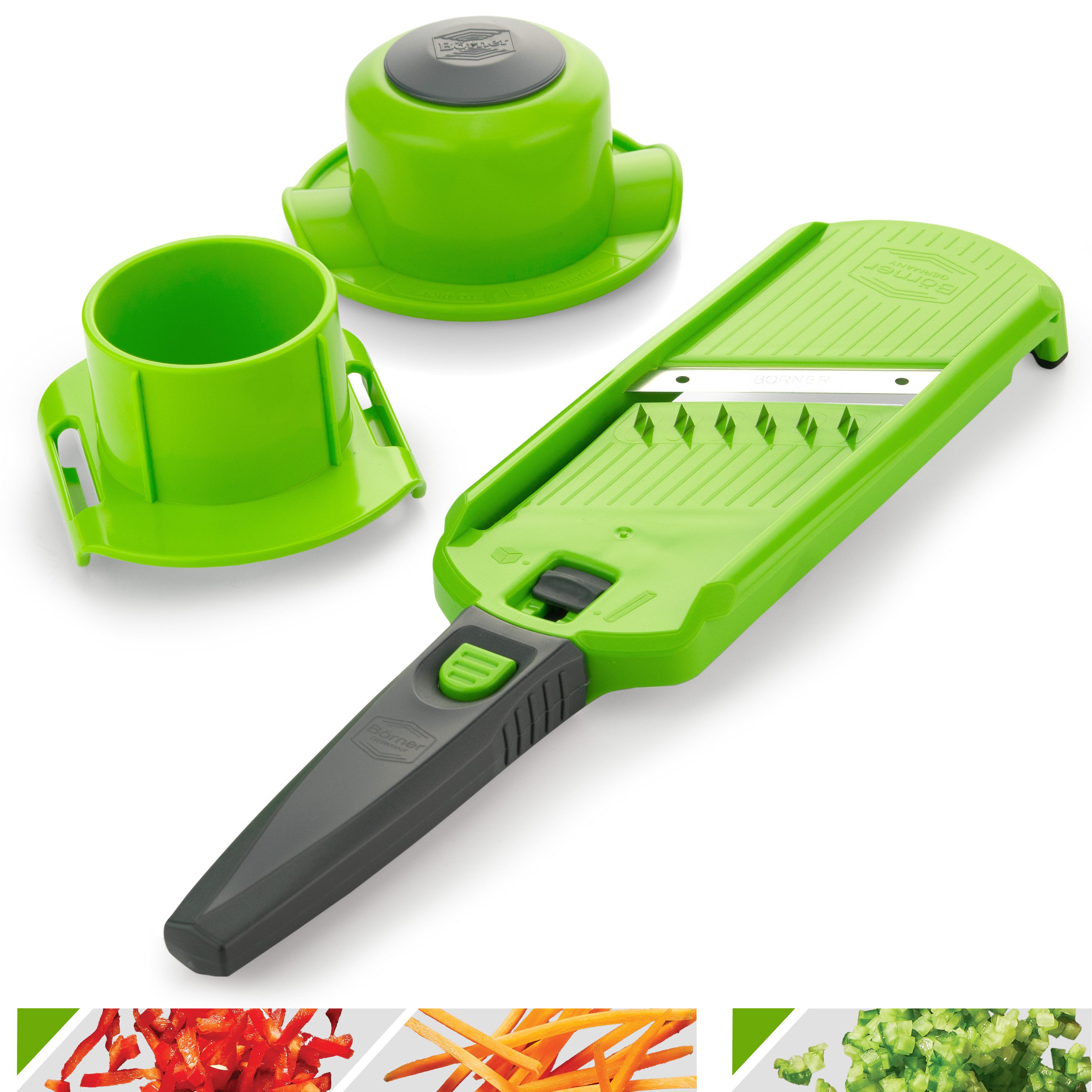 Produktinformationen "Börner Multi Dicer und Julienne Gemüseschneider" Perfekte Würfel schneiden mit dem Multischneider! Je nach Winkel der Schneidoberfläche können Sie ganz einfach zwischen Würfeln und Stiften wechseln. Schneiden Sie mit der Juliennefunktion leckere Julienne-Streifen aus etwa Gurken, Möhren, Zucchini oder Lauch für die asiatische Küche oder gesunde, fettarme Suppen. Je länger das Gemüse, desto länger werden auch die Streifen, wenn sie das Gemüse längs auf den Dicer legen. So ist es möglich, schnell und einfach super lange Gemüsestreifen zu zaubern, ein echter Hingucker. Mit der nächsten Funktion wird es aufregend: Endlich perfekte Würfel schneiden, um Gerichte optisch aufs nächste Level zu bringen. Legen Sie dafür die im Lieferumfang enthaltene Schiene auf den Dicer auf, legen Sie das Gemüse ein und stecken Sie den Mini Fruchthalter oben auf. Drehen Sie nach jeder Schnittbewegung nach unten den Fruchthalter um 90° bis Sie merken, dass er einrastet. So werden die Seiten der Würfel genau gleich groß. Jetzt können sie perfekt Zwiebeln würfeln und vereinfachen sich damit die Kochvorbereitung. Und das Beste daran: Ihre Hand ist während des Schneidvorgangs perfekt durch Ihren Sicherheitsfruchthalter geschützt! Dadurch können Sie auch kleinstes Gemüse sicher klein würfeln. Zaubern Sie Zwiebelwürfel, Gurkenwürfel, Karottenwürfel und vieles mehr für leckere Brotbeläge, Suppen, Eintöpfe und Aufläufe. Wie auch die weiteren Multi Produkte wie Multi Slicer und Multi Peeler, passt der Multi Dicer auch wieder ohne Probleme in Ihre Schublade und spart Ihnen Platz in Ihrer Küche. Finden Sie hier das passende Zubehör und tauschen Sie ganz schnell zwischen Schäler, Hobel und Dicer. Maße: Gemüsehobel: 31cm x 7,5cm x 3cm Fruchthalter: 10,3cm x 10,3cm x 5,5cm Griff: 11cm x 3cm x 2cm Technische Daten: Stifte und Streifen Mit rutschfesten Gummifüßen Griff kompatible mit Multi Slicer und Multi Peeler Aufsatz BPA-freier Kunststoff Frei von Weichmachern und Schadstoffen Mikrofein-geschliffene Edelstahlmesser