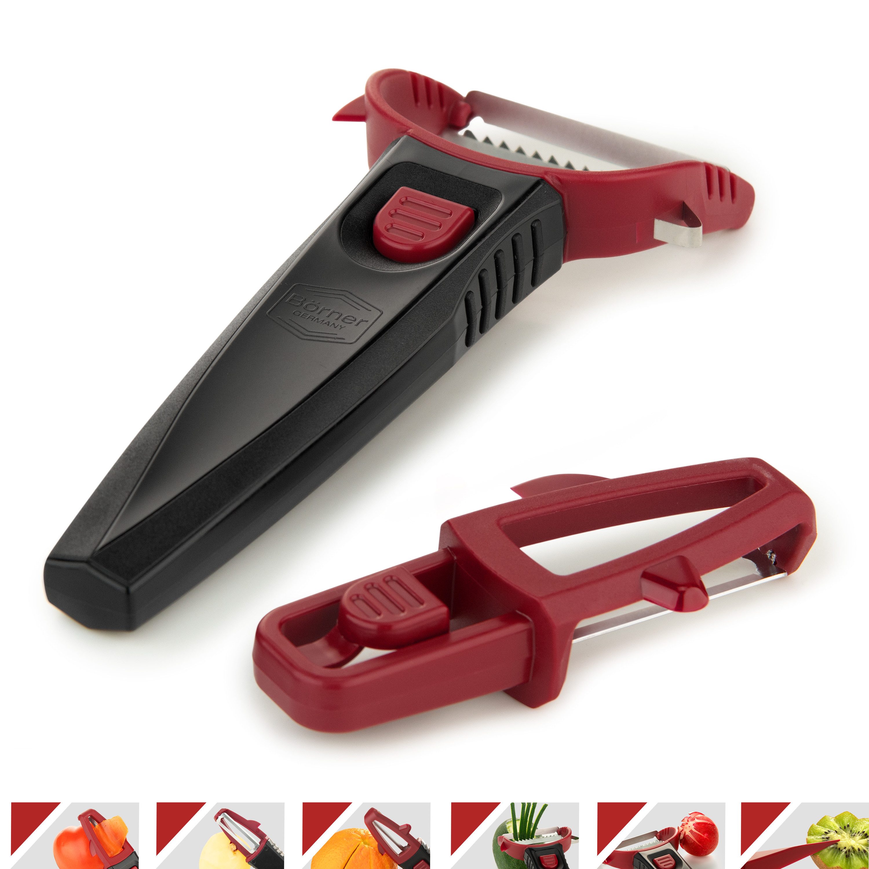 Produktinformationen "Börner Multi Peeler 3er Set" Das platzsparende Julienne- und Kartoffelschäler Set Zwei Schäler - zwei Funktionen - ein Griff Der praktische Multi Griff sorgt mit seinen wechselbaren Schäleraufsätzen für Abwechslung in der Küche. Mit dem Julienneschäler Aufsatz können Sie einfach leckere Gemüsespaghettis aus Zucchini oder Möhren herstellen. Ein Streifenschäler, der das Zubereiten von gesundem Essen erleichtert. Einfach den Aufsatz auf ihren Multi Griff setzen und loslegen. Durch die einfach Handhabung gelingen Ihnen die leckeren Gemüsenudeln besonders schnell. Der Schäler eignet sich auch ideal zum Entfernen von ungewollten braunen Stellen im Gemüse wie z.B. Kartoffelaugen. Durch die angebrachte Öse am Rand sind die Stellen ganz einfach entfernt ohne Gemüse zu verschwenden. Als weitere Funktion ist der Julienneschäler als Zitrus- und Orangenöffner geeignet, da noch eine scharfe Spitze an der Seite zur einfachen Öffnung der Schale vorhanden ist. Der Stabschäler Aufsatz eignet sich ideal als Obst- und Gemüseschäler, da er vor allem sehr dünn schälen kann und somit wenig verschwendet wird. Auch dieser Kartoffelschäler hat die Funktionen zum Ausstechen, Garnieren und Zitrus öffnen. Maße: Multi Peeler: 17cm x 7cm x 3cm Griff: 11,5cm x 3cm x 2cm Y-Aufsatz: 14cm x 7cm x 2,5cm Stab-Aufsatz: 9,5cm x 4,5cm x 2cm Technische Daten: Griff mit verschiedenen Aufsätzen kompatibel Hochwertige Wellenklinge aus rostfreiem Edelstahl Robuster Schäler mit Edelstahlklinge Funktionelle Form Leichte Bedienbarkeit und Reinigung Für Links- und Rechtshänder geeignet Frei von Weichmachern und BPA