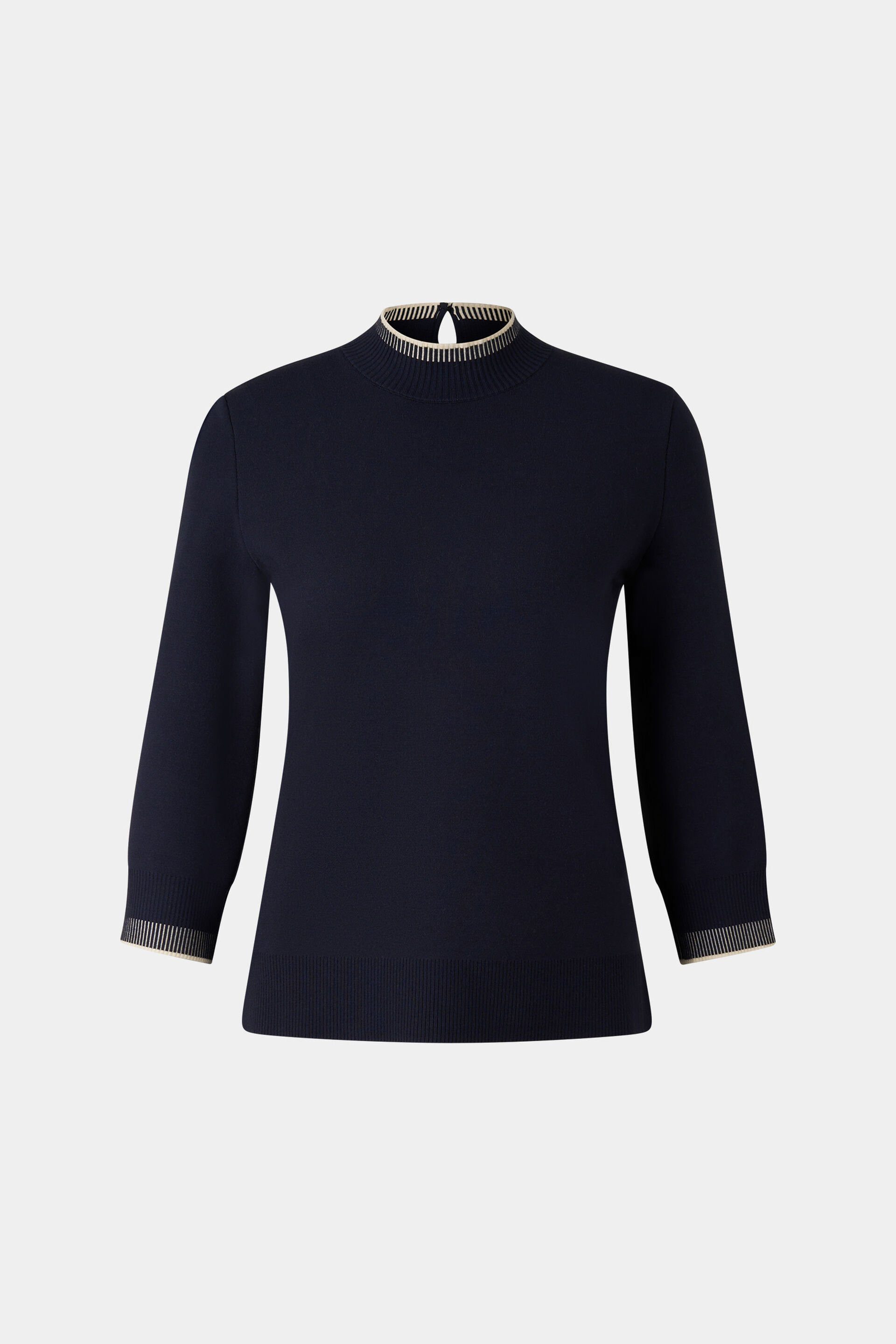 Viskose-Doubleface mit kontrastiver Innenseite verleiht dem Strick-Shirt Berrit das moderne Flair – ergänzt durch Akzente am Stehkragen und den Ärmelbündchen. Für einen Eyecatcher sorgt ein rückseitiger Knopfverschluss, abgerundet durch Seitenschlitze am Saum. Passt zur Pants Benette.