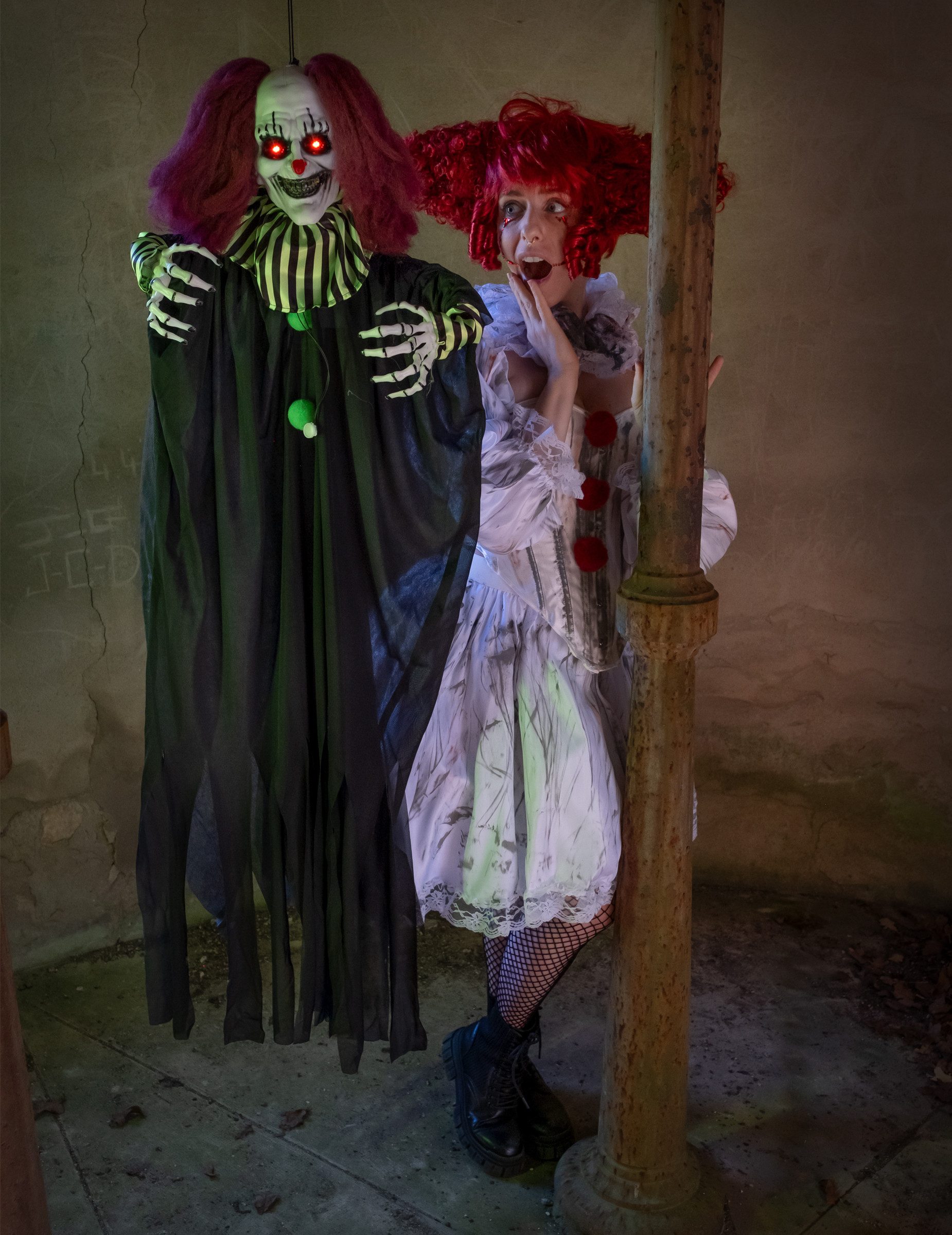 Bringen Sie den Schrecken von oben in Ihr Zuhause – mit diesem etwa 130 cm großen, animierten Hänge-Clown. Diese gruselige Figur in knalligen Farben ist alles andere als lustig. Mit seinen wirren roten Haaren, dem neon-grünen und schwarzen Kostüm sowie dem knochigen Gesicht in einer verstörenden Grimasse zieht er sofort alle Blicke auf sich. Sobald ein Geräusch erkannt wird, aktiviert der eingebaute Sensor die gruselige Show: Die Augen des Clowns beginnen unheilvoll zu leuchten, schrille Geräusche ertönen und eine unheimliche Stimmung breitet sich aus. Der Clown ist leicht und einfach aufzuhängen. Er wird mit 3 AAA-Batterien betrieben (nicht enthalten) und kombiniert effektvolle Licht- und Soundeffekte. Ideal für Halloween-Dekorationen, dunkle Themenräume, bewegte Schaufenster oder jeden Ort, an dem Sie eine schaurige Atmosphäre schaffen wollen – dieser Hänge-Clown sorgt garantiert für Gänsehaut.