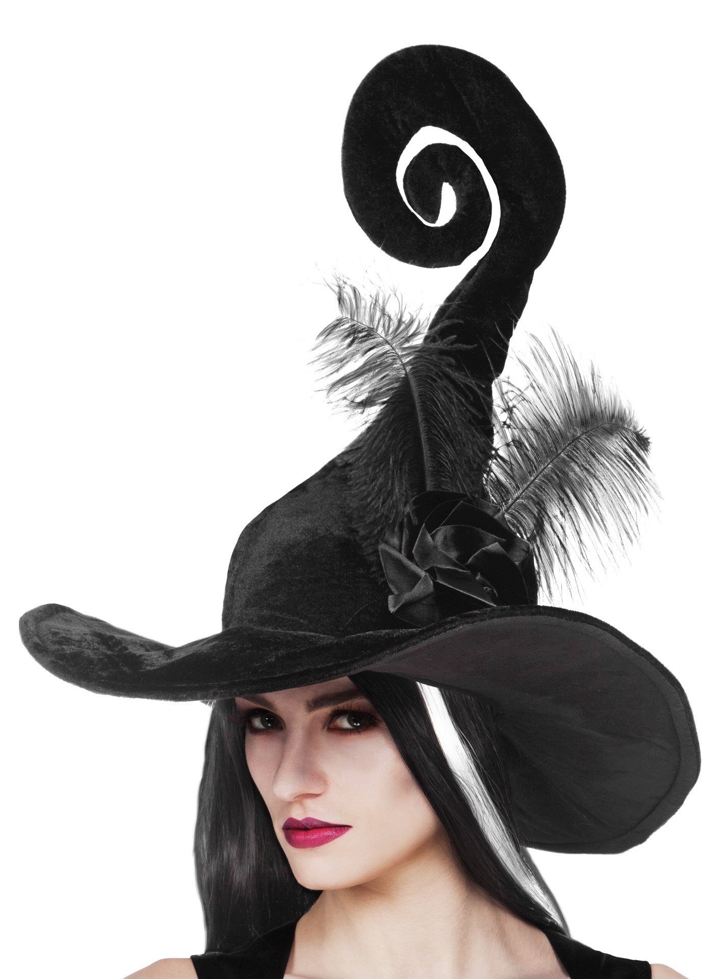 Skurril, sonderbar, schräg - und deshalb umso faszinierender. Der Hexenhut Traumhexe mit eingedrehter Spitze wird auf dem Hexentanzplatz garantiert für Aufsehen sorgen. Die zauberhafte Dekoration aus Stoffblume und Pfauenfedern rundet den samtigen Hexenhut ausgesprochen edel ab. Durch den eingearbeiteten Draht könnt Ihr Spitze und Krempe nach Euren Vorstellungen biegen.