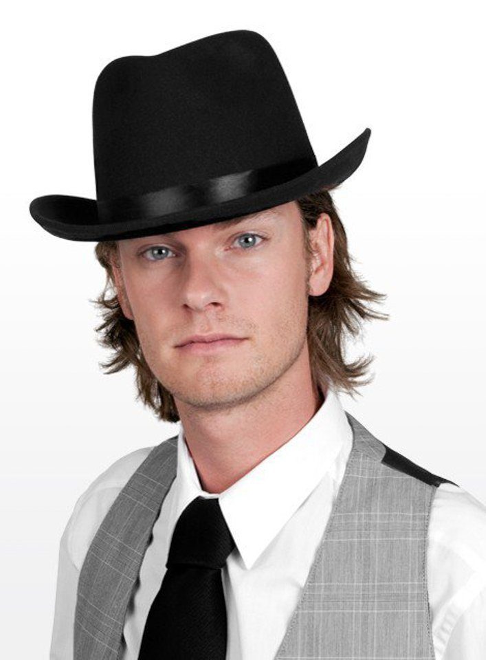 Der Fedora ist ein echter Hutklassiker, der typischerweise aus Filz gefertigt wird. Wer ihn trägt, erweckt sofort Assoziationen mit Gangstern, Privatdetektiven und “Film Noir“-Charakteren. Humphrey Bogart zum Beispiel trug in seinen Filmen gerne Fedora und Trenchcoat. Unser Fedora ist schwarz und weist die typischen Einbuchtungen auf. Ein stilvolles Hutband trennt die Krempe optisch von der Krone. Für sicheren Tragekomfort sitzt innen ein elastisches Gummiband. Passend für Kopfumfänge bis ca. 62 cm. Mit diesem Hut reiht man sich ein in eine Reihe legendärer Fedora-Träger!