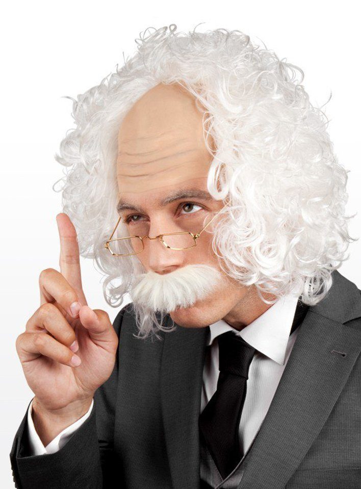 Der Professor kommt mit krausem Lockenkopf inklusive Denkerstirn daher. Die Perücke aus weißem Kunsthaar sitzt dabei auf einer flexiblen Kunststoffhaube, die sich in vier eindrucksvollen Falten kräuselt. Imposant ist auch der Schnäuzer, ebenfalls aus schneeweißem Kunsthaar, der selbstklebend unter jeder Nase haftet. Auf der Nase fehlt nur noch die silberne Lesebrille aus flexiblem Drahtgestell, so wird jeder im Nu zum intellektuellen Partystar!