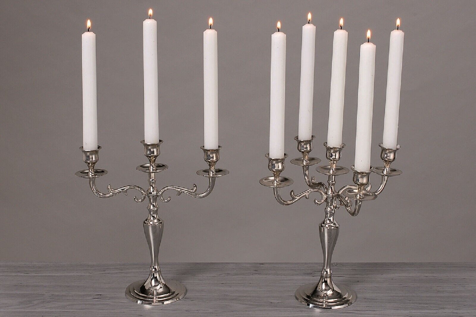 Silvoller 5 armiger Kerzenleuchter im klassischen Stil. Fester Stand und passend für die handelsüblichen Kerzen. Wunderschöner Blickfang für Ihren Wohnraum, passend für Esszimmertisch, Sideboard oder Beistelltisch. Ideal zum Candle-Light-Dinner.