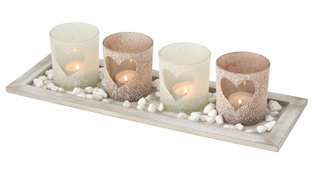 Wird als Set verkauft. Dieses Stück wird in einer Geschenkbox geliefert und enthält folgende Artikel: 2 winterweiße frostige Teelichtkerzenbecher, 2 bernsteinfarbene Frostteelichtkerzenbecher, 1 Päckchen dekorative weiße Kieselsteine, 1 Tablett aus Naturholz.