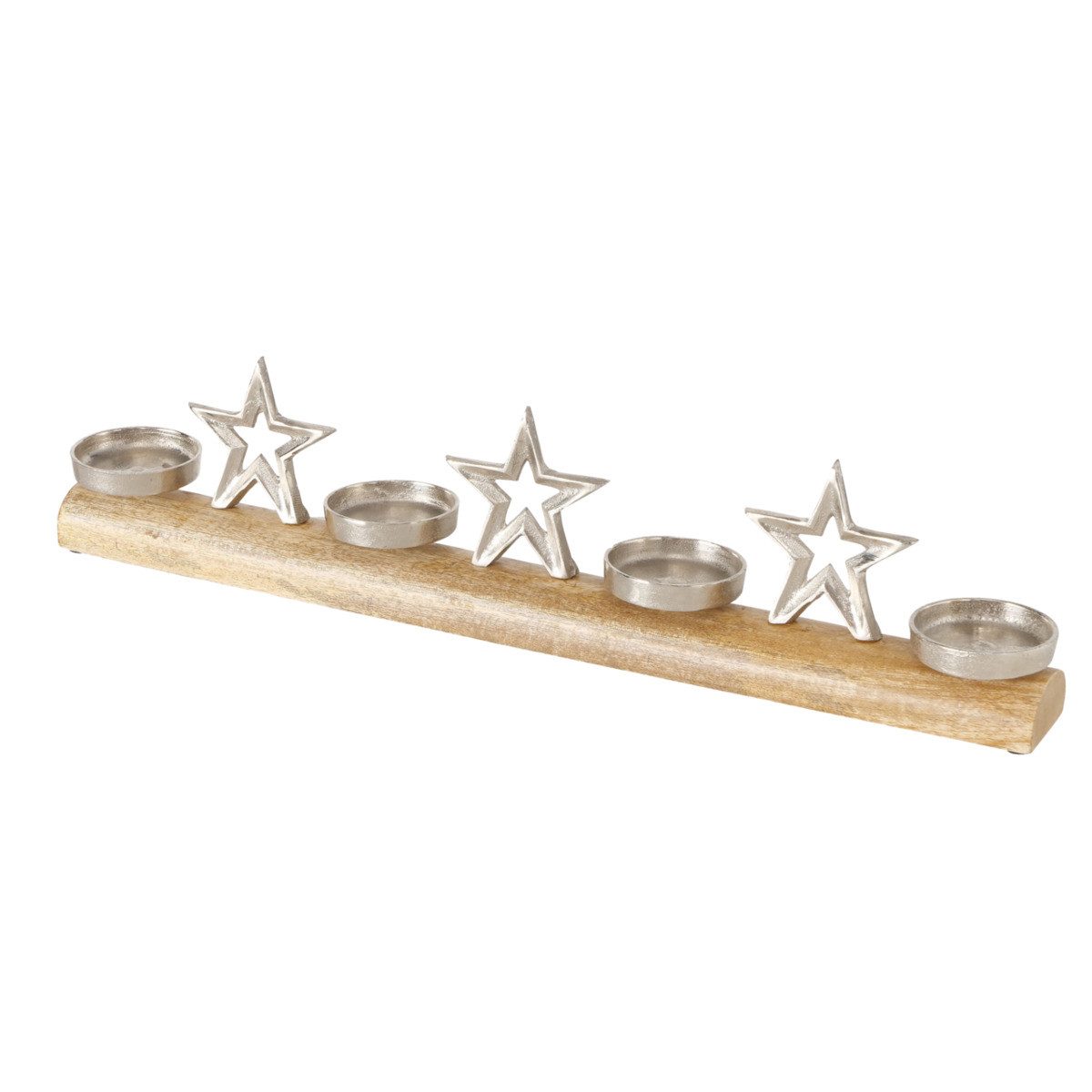 Hochwertige Materialien: Der Kerzenleuchter besteht aus einer Kombination von Holz und Metall. Das Grundmaterial ist edles Mango-Holz, das für Wärme und Natürlichkeit sorgt, während das Metallteile vernickelt sind, was ihnen ein glänzendes, silbernes Finish verleiht.