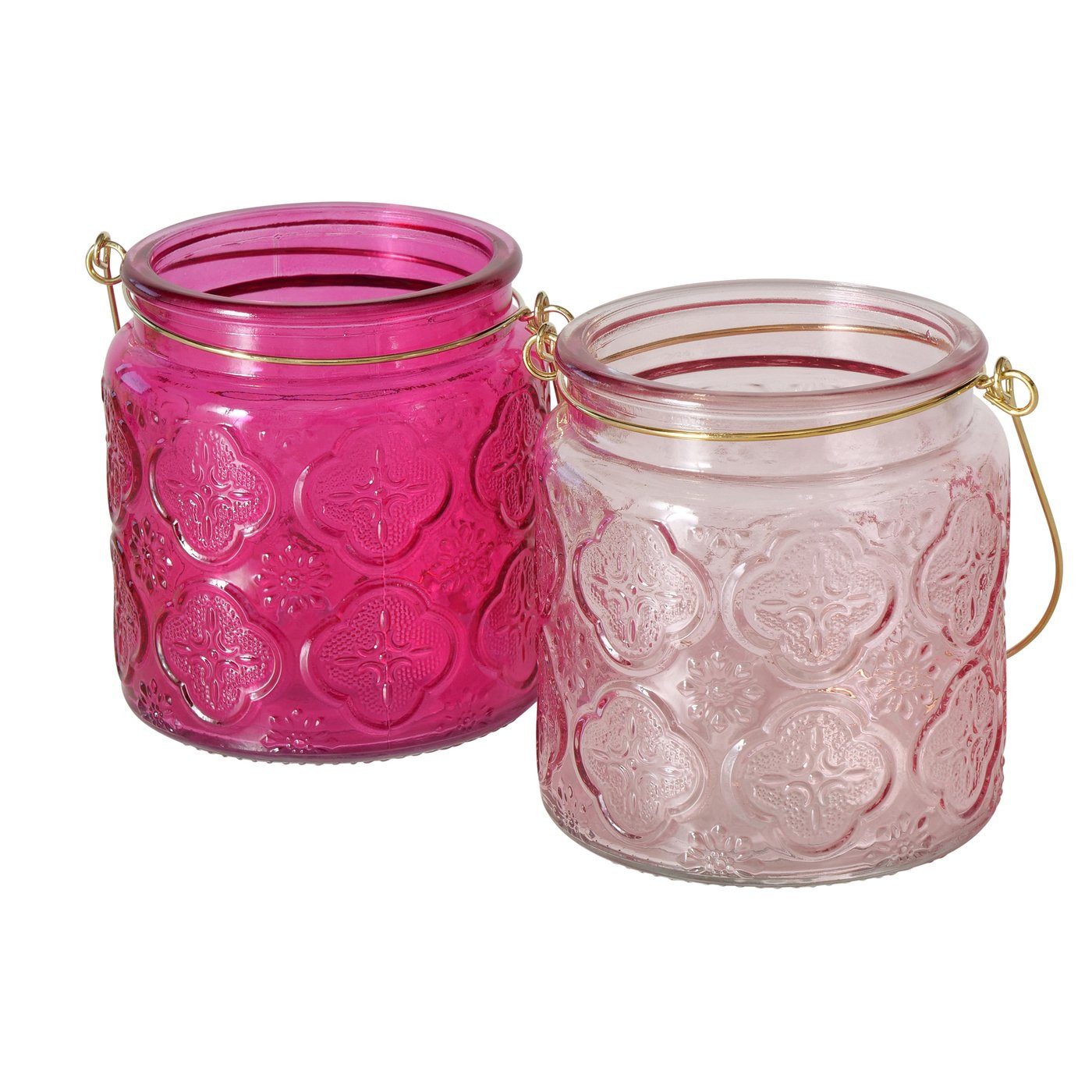 Elegante Vintage Deko: Das 2er Set Teelichthalter Windlicht aus Glas in Pink Rosa und der Henkel zum hängen aus Metal in gold, bringt glamourösen Glanz