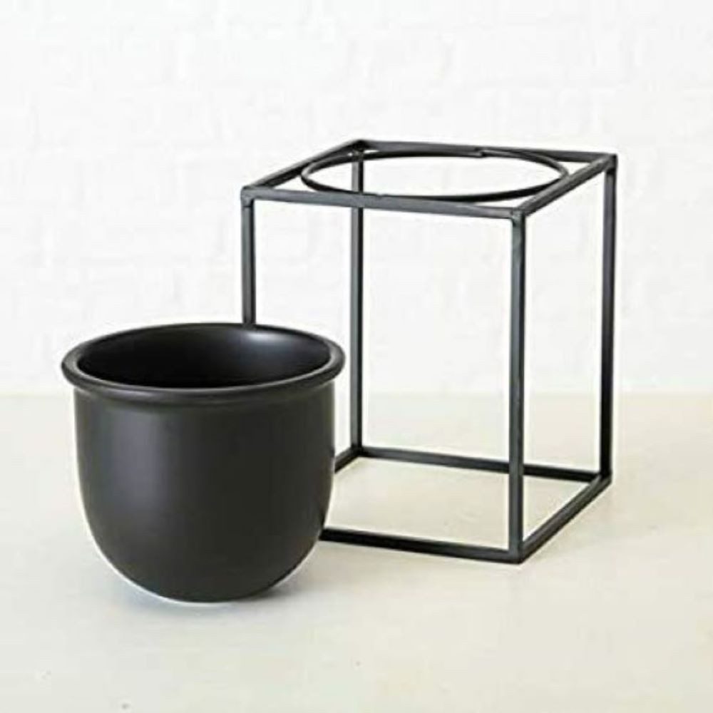 Der Pflanztopf Kumbo besteht aus einem mattschwarz pulverbeschichteten Eisengestell und einem mattschwarzen Dolomit-Pflanztopf. Mit den Maßen von ca. 16 x 20 x 16 cm (Breite x Höhe x Tiefe) ist er ideal für die Nutzung im Innenbereich geeignet.