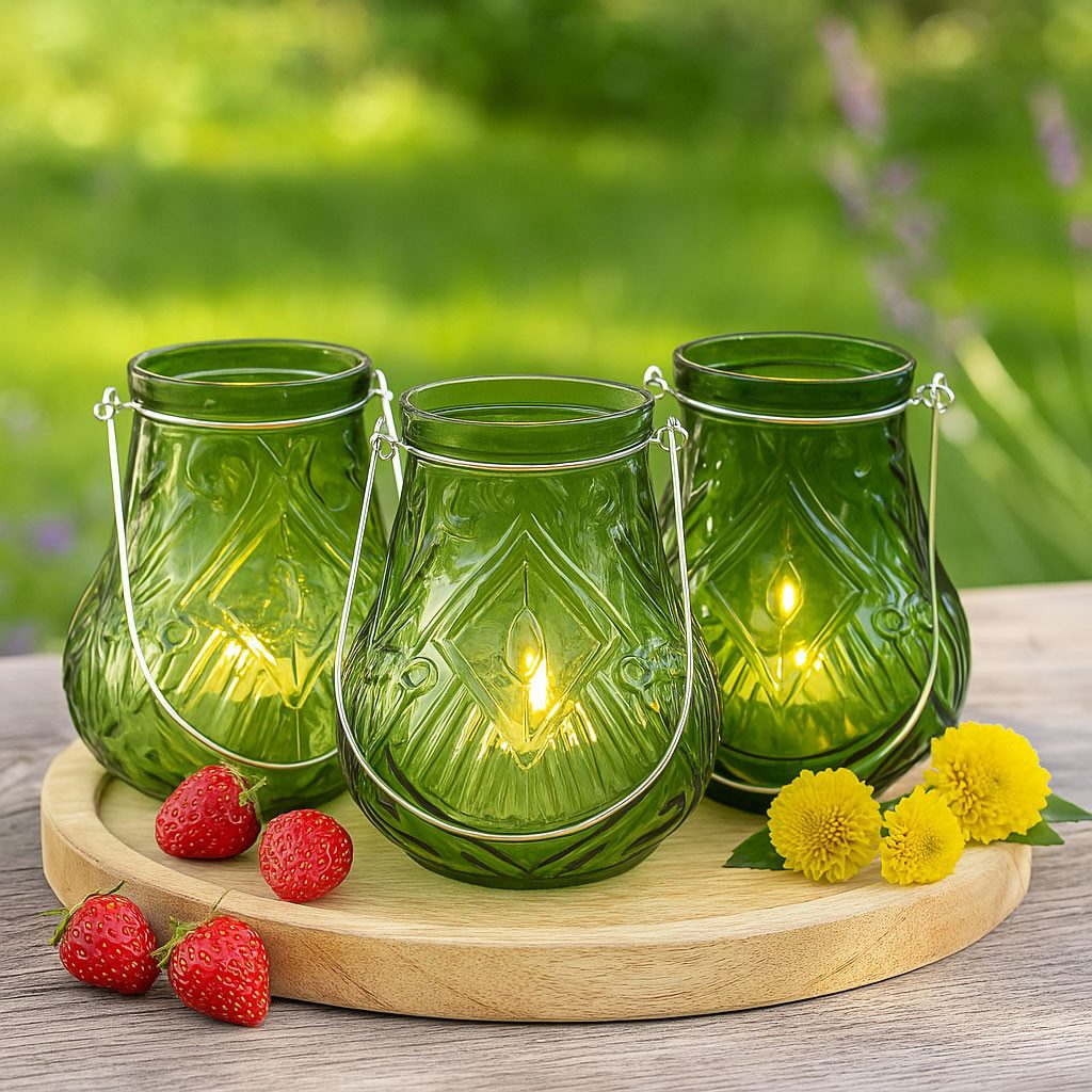 Dieses dekorative 3er-Set Windlichter aus grünem Glas bringt stilvolle Lichtakzente in Ihr Zuhause. Die Gläser sind farblich sortiert in verschiedenen Grüntönen – von zartem Lindgrün bis hin zu sattem Tannengrün – und veredelt mit erhabenen Ornamenten, die dem Lichtspiel eine besondere Tiefe verleihen. Ob als Tischdekoration, auf der Fensterbank oder im Garten – mit einem Teelicht oder kleinen Kerzen bestückt sorgen die Windlichter für eine warme, behagliche Atmosphäre. Das strukturierte Glas verleiht den Leuchtern eine elegante, fast nostalgische Note und lässt sich wunderbar in moderne wie auch klassische Wohnstile integrieren.