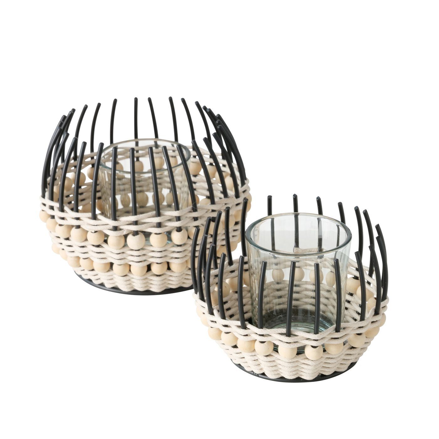 Stilvolles Windlicht 2er-Set in moderner Korboptik – Eisen & Schima Korbgeflecht Verleihen Sie Ihrem Zuhause oder Garten mit unserem exklusiven Windlicht-Set in einzigartiger Korboptik eine besondere Note. Dieses Set besteht aus zwei Windlichtern unterschiedlicher Höhe (7,5 cm und 9,5 cm), die eine harmonische Kombination aus natürlicher Eleganz und modernem Design bieten. Gefertigt aus robustem Eisen und umflochten mit hochwertigem Schima (Theaceae) Korbgeflecht, vereint dieses Duo Langlebigkeit mit einem Hauch von Natur. Die Farbgebung in Natur und Schwarz fügt sich nahtlos in jede Einrichtung ein und schafft eine warme, einladende Atmosphäre, egal ob drinnen auf dem Tisch oder draußen auf der Terrasse. Das durchdachte Design dieser Windlichter lässt das Licht auf wunderschöne Weise durch das Korbgeflecht scheinen, wodurch einzigartige Lichtspiele entstehen, die jeden Raum in ein gemütliches Ambiente tauchen. Produkthighlights: Einzigartige Korboptik: Eisenrahmen mit Schima Korbgeflecht für einen natürlichen Look. Zwei Größen im Set: Mit Höhen von 7,5 cm und 9,5 cm ideal für abwechslungsreiche Lichtakzente. Natur & Schwarz: Zeitlose Farbkombination, die Vielseitigkeit und Stil verspricht. Robuste Materialien: Eisen und Schima Korbgeflecht garantieren Langlebigkeit und Stabilität. Vielseitig einsetzbar: Perfekt für Innenräume und Außenbereiche, schafft eine gemütliche Atmosphäre. Dieses Windlicht-Set ist die perfekte Wahl für alle, die ihr Heim mit stilvollen und funktionellen Dekorationselementen bereichern möchten. Ob als Geschenk für einen geliebten Menschen oder als elegantes Accessoire für Ihr eigenes Zuhause – dieses Set verspricht, jeden Raum zu einem Ort der Ruhe und Entspannung zu machen.