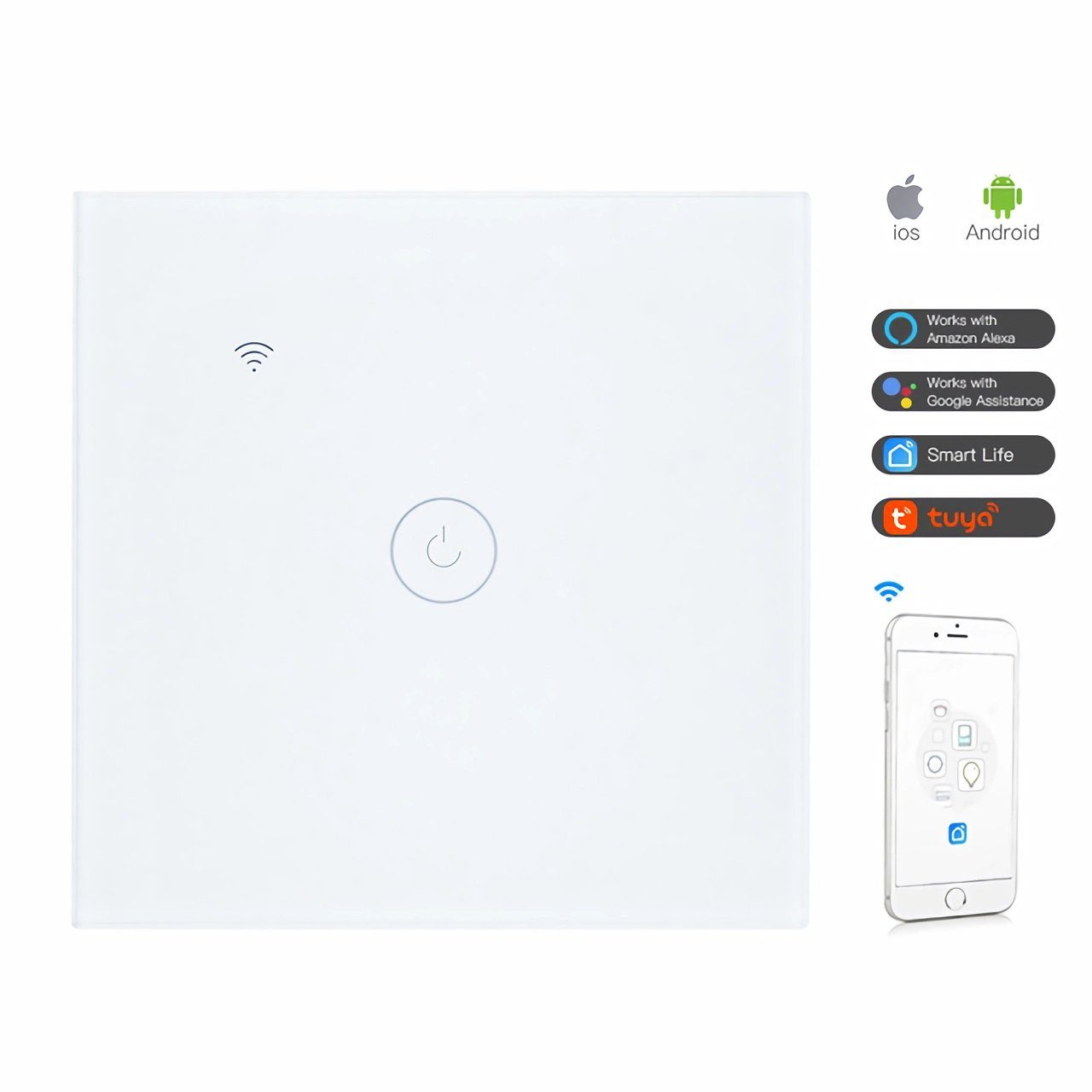 -- Material: ABS-Schale und Glaspanel -- Typ: 1 Gang -- Nennspannung: AC 100-240V 50/60Hz -- Nennleistung: 300W / Gang -- Drahtlose Frequenz: 2,4GHz -- Wireless Standard: 802.11b/g/n -- Farbe: Weiß |