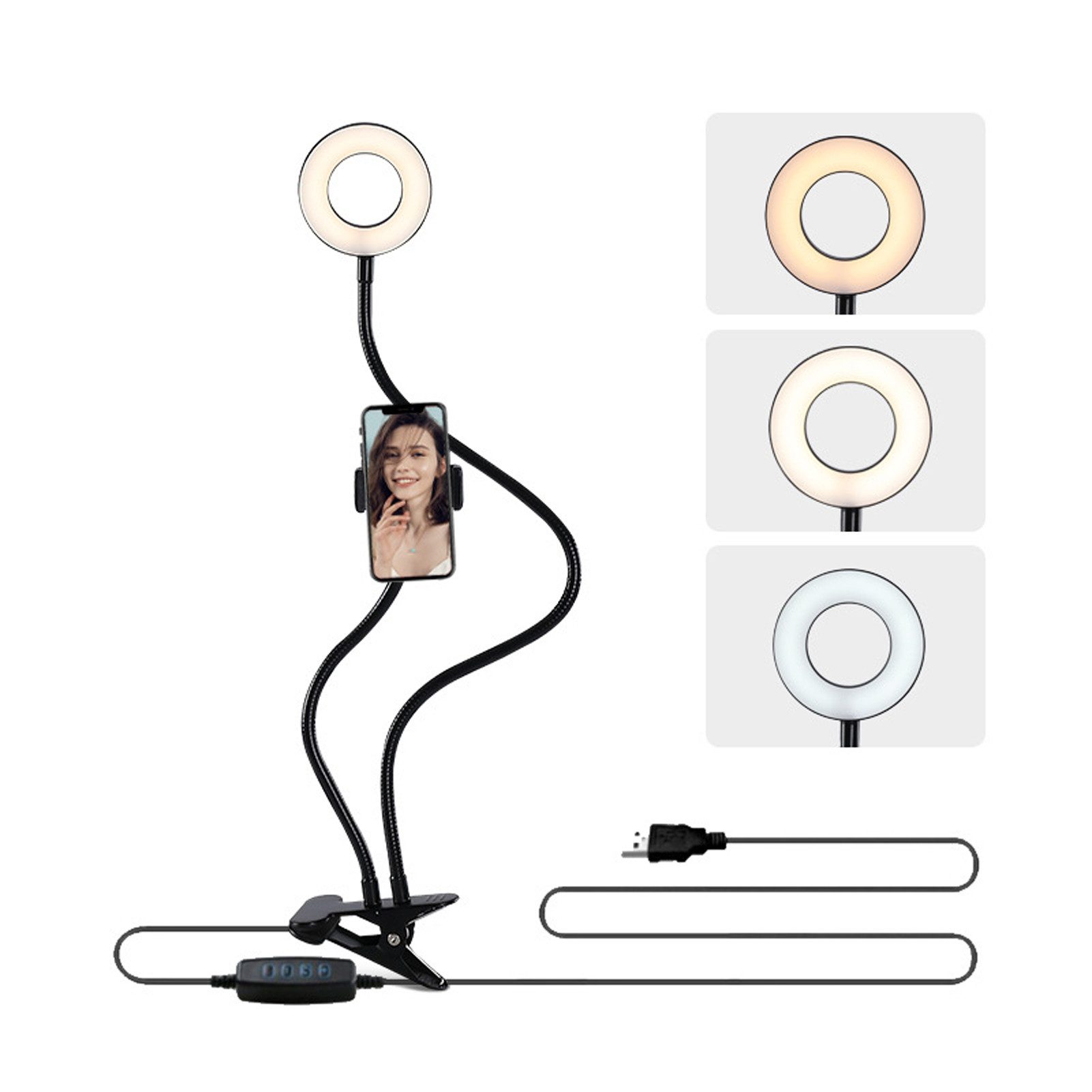 Das Ringlicht mit einem Clip ist das perfekte Produkt für alle, die ihr Handy als Kamera verwenden. Es hat eine flexible Schwanenhalskonstruktion, die es in jeder Position halten kann, und es ist dimmbar, so dass Sie die Helligkeit an Ihre Bedürfnisse anpassen können. Das Ringlicht hat zehn Helligkeitsstufen und wird über USB mit Strom versorgt. Das LED-Ringlicht hat eine Leistung von 10W und ist energieeffizient. Es ist kompatibel mit allen Marken und kann als Studio-Beleuchtungsset oder als Fotostudio-Zubehör verwendet werden. Das Set enthält eine LED-Lampe und einen Clip mit einer Einheit pro Set.