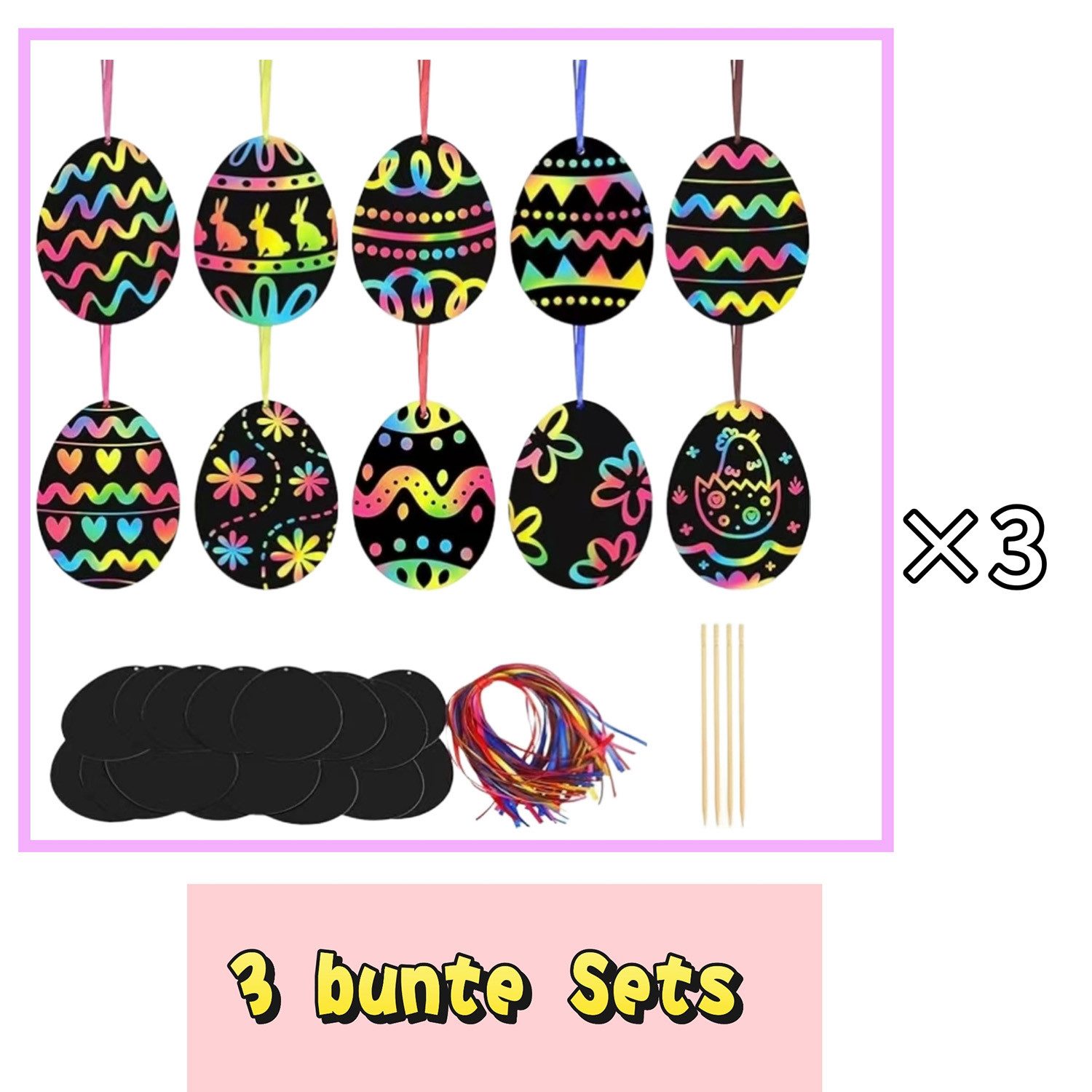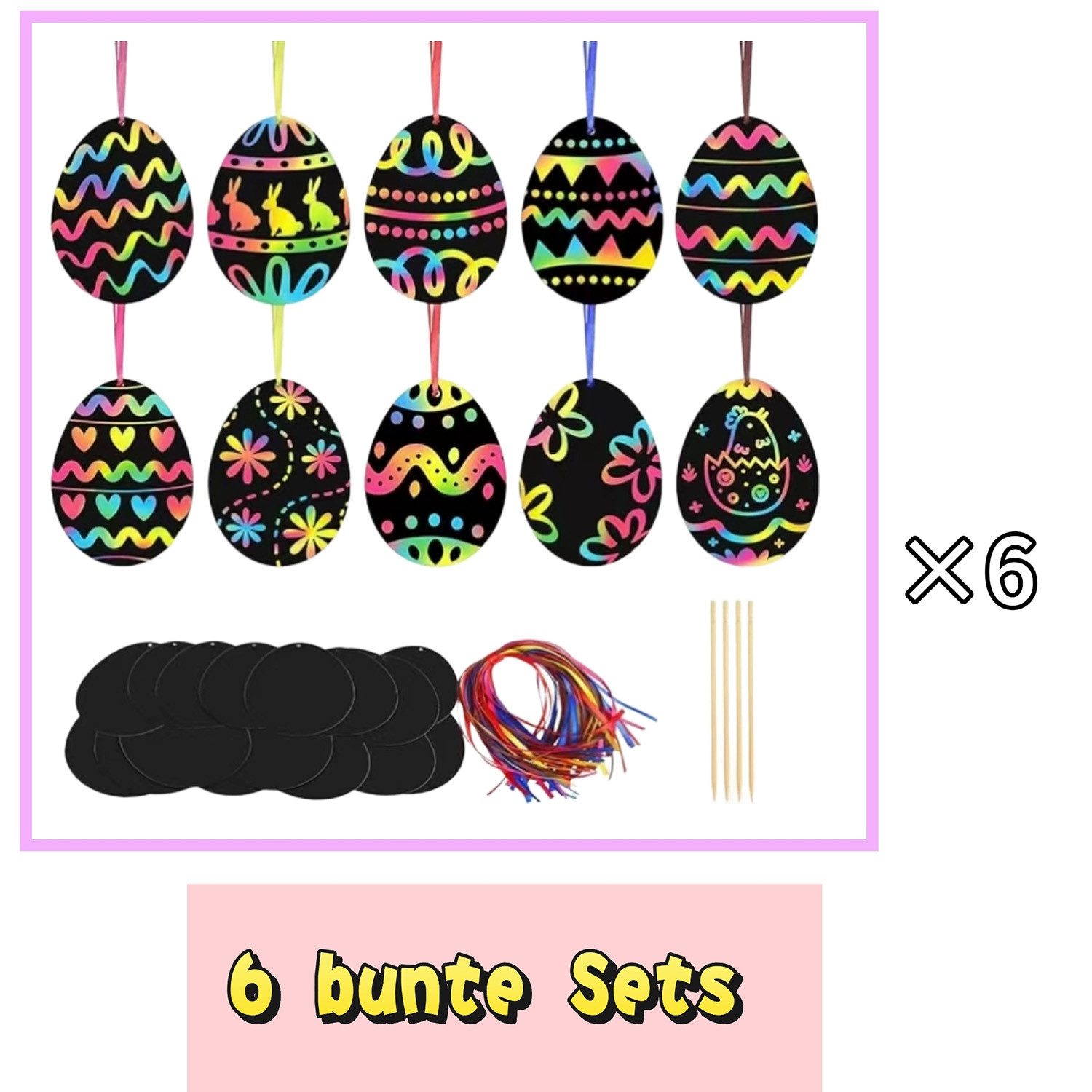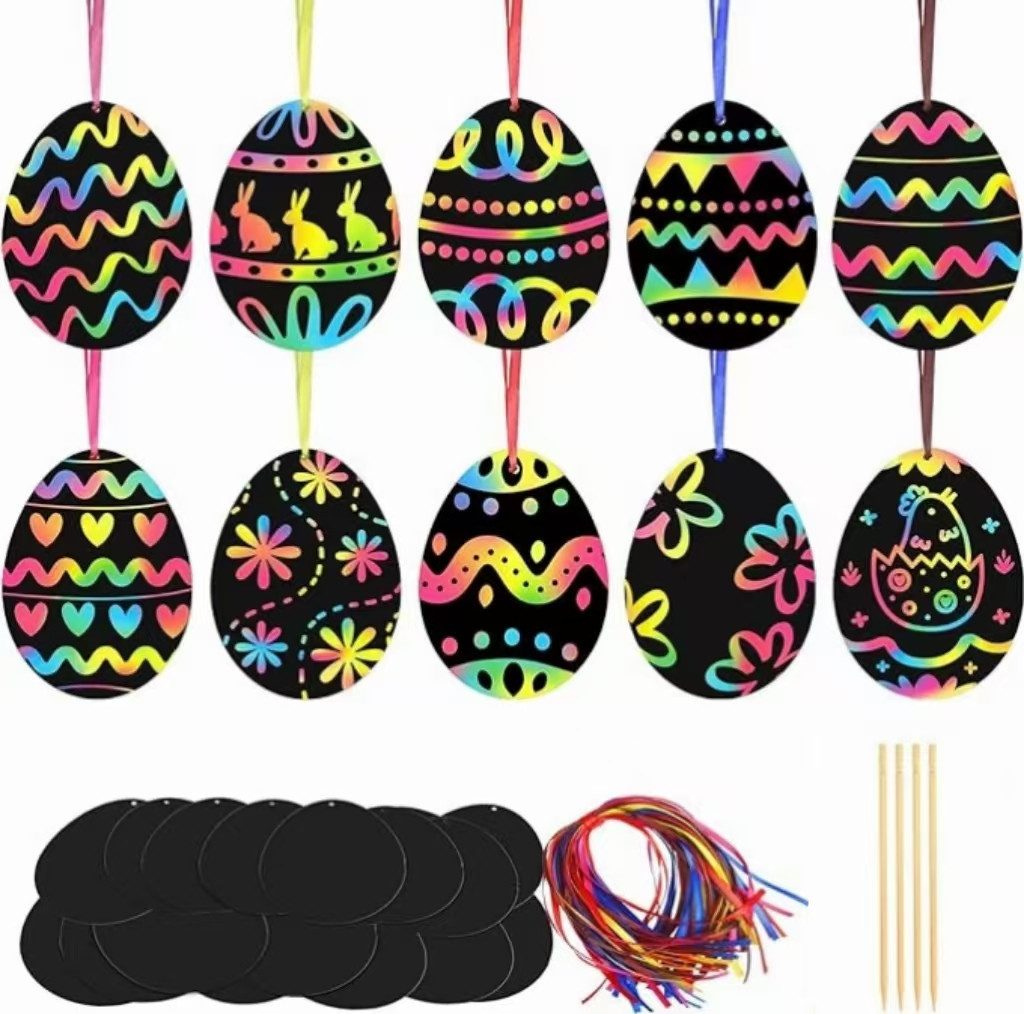 Unsere Kratzkunst ist eine angenehme Aktivität für alle Altersgruppen und Fähigkeitsstufen. Die Regenbogenfarben sind unter einer schwarzen matten Schicht verborgen – einfach kratzen und beeindruckende Muster enthüllen. Das Aufhängen mit den mitgelieferten roten Bändern verleiht den Dekorationen zusätzlichen Ostercharme.