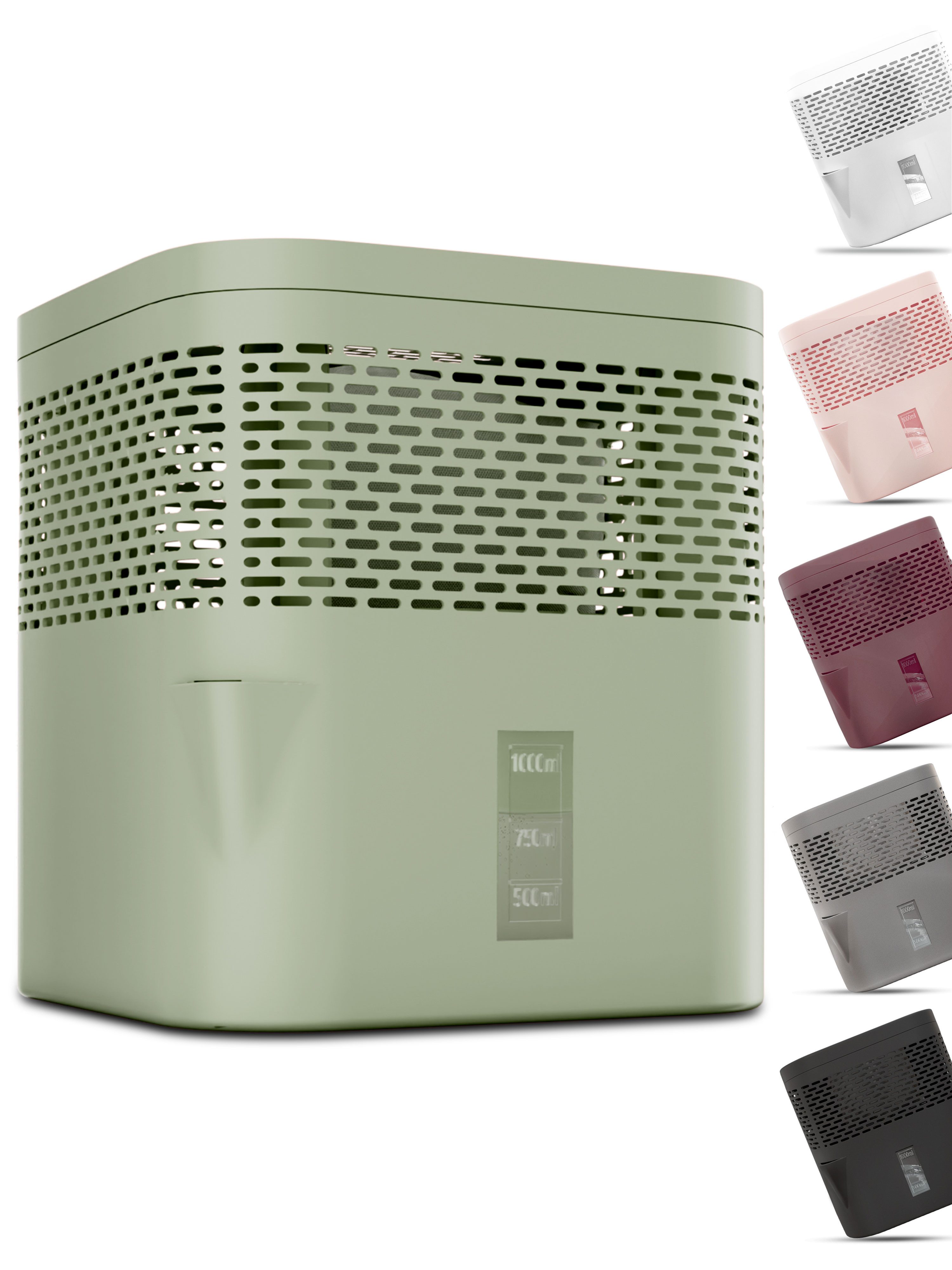 Top-Features | Elegantes Design, 360 Grad Belüftung für maximale Entfeuchtung, Austauschbares Granulat, Ausgiesser, Füllstandsanzeige, 1 Liter Fassungsvolumen |