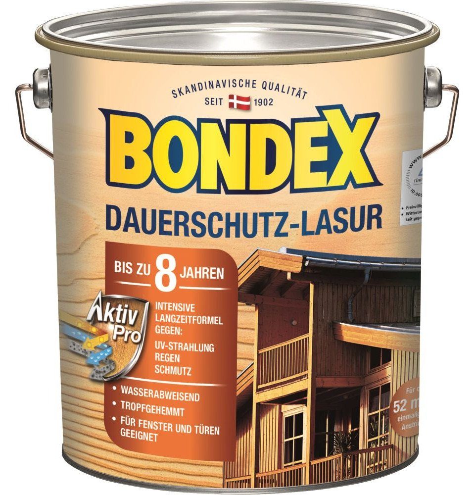 Die Bondex Dauerschutz-Lasur pflegt und schützt Holz im Außenbereich zuverlässig. Sie ist in unterschiedlichen Farben erhältlich. Die lösemittelhaltige und dickschichtige Dauerschutz-Lasur ist besonders für Fenster und Außentüren, aber auch für viele andere Hölzer im Außenbereich gegeben.