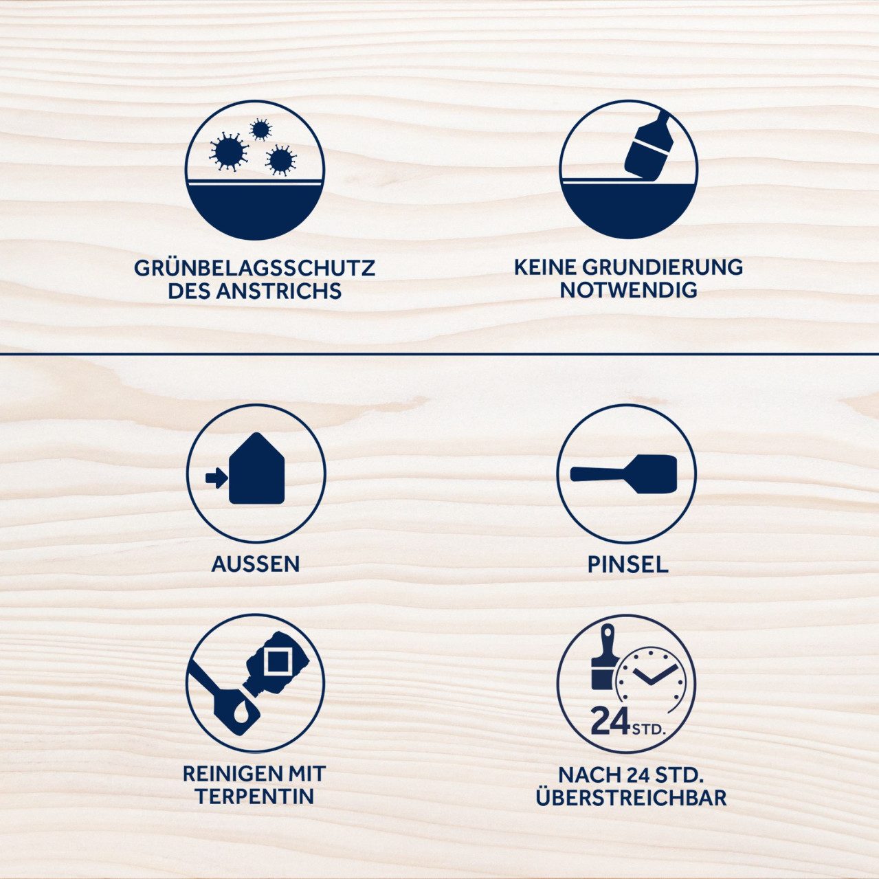 Trocknungszeit: | Staubtrocken nach ca. 3 Stunde. Überstreichbar nach ca. 4 Stunden (23°C / 60 % rel. Luftfeuchtigkeit). Bei niedrigen Temperaturen und/oder hoher Luftfeuchtigkeit wird die Trockenzeit verlängert. Bei gewissen Holzarten (z.B. Tropenhölzer, Eiche etc.) können Holzinhaltstoffe die Trocknung verzögern. Probebeschichtung durchführen. |