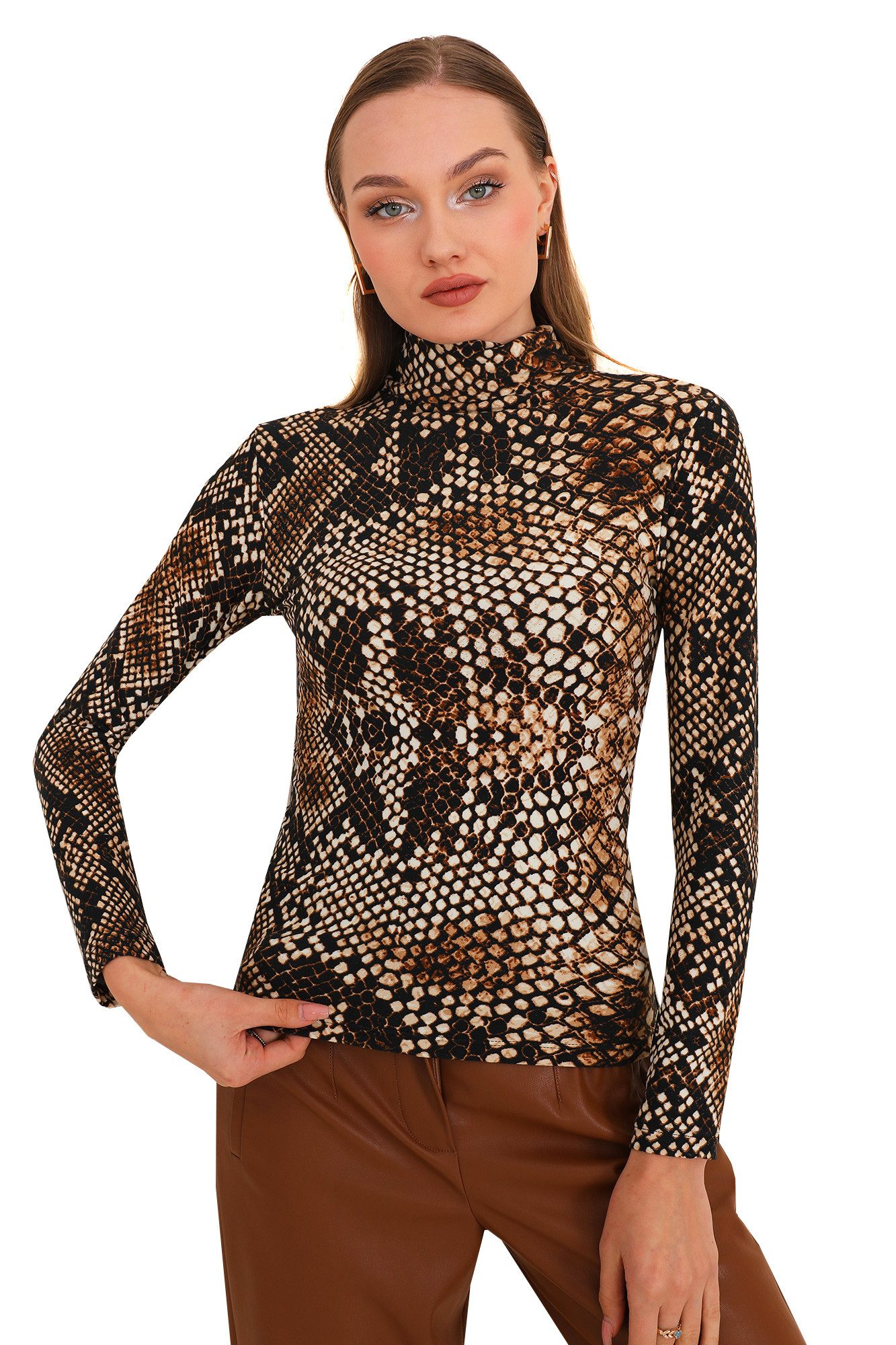 Der Rollkragen fügt dem Shirt nicht nur eine elegante Note hinzu, sondern sorgt auch für zusätzliche Wärme an kühleren Tagen. Perfekt für einen auffälligen Auftritt bei kühlem Wetter oder um Ihrem Outfit das gewisse Etwas zu verleihen – dieses Rollkragenpullover mit Schlangenhaut Muster ist eine clevere Wahl.