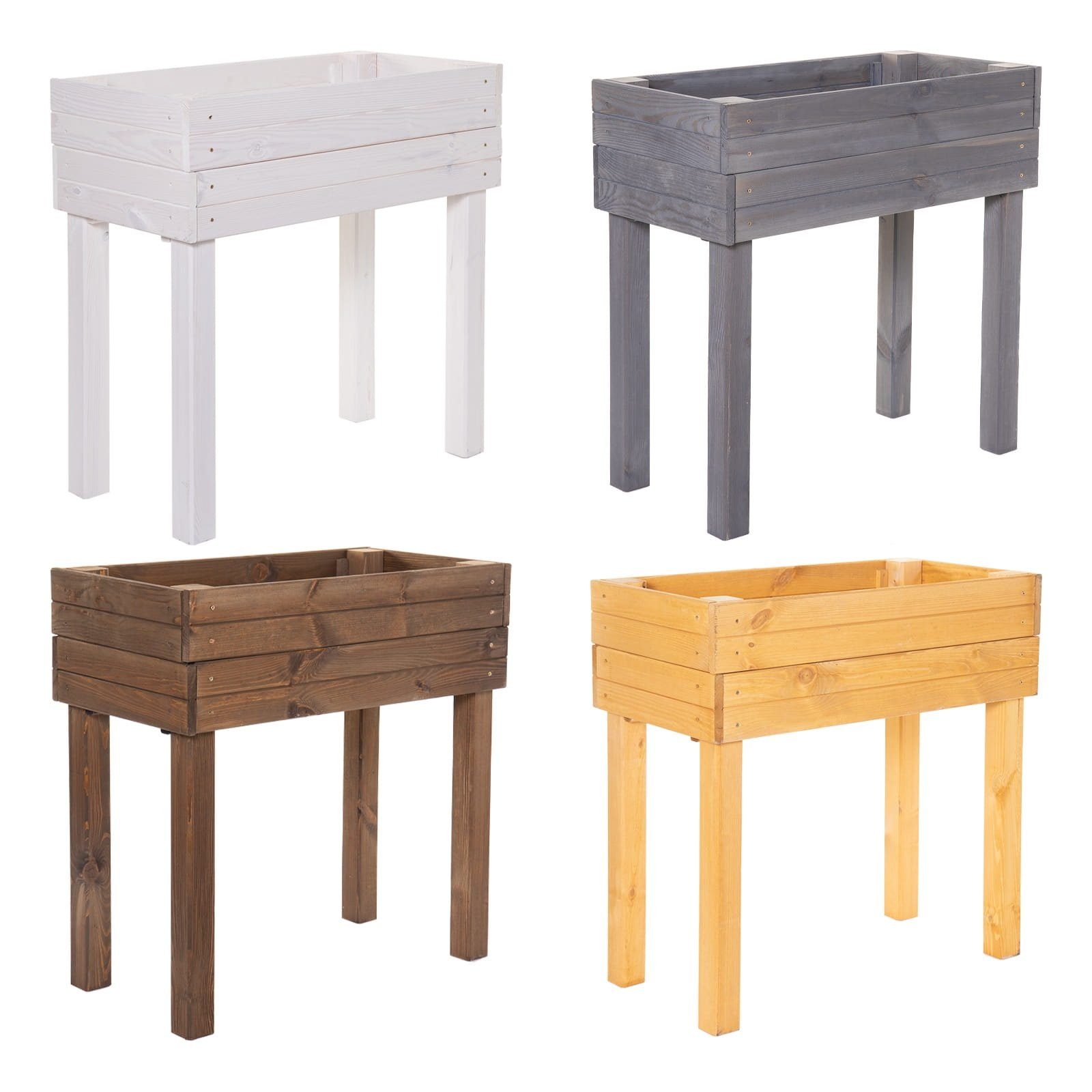 Das Hochbeet aus imprägniertem Kiefernholz ist eine geschmackvolle Möglichkeit um Ihre kreativen Ideen im Bereich Bepflanzen und Dekorieren zu vereinen. Sie können den Pflanzkasten für die Frühjahrsbepflanzung auf Ihrem Balkon oder Ihrer Terrasse farbenfroh mit Blumen wie Stiefmütterchen und Veilchen nutzen. Ein kleines Kräuterbeet mit beliebten Kräutern wie Basilikum, Petersilie und Thymian anlegen oder Gemüsepflanzen wie kleine Tomaten und Salate einsehen. Mit diesem Blumenkasten treffen Sie auf jeden Fall die richtige Wahl. Er hat eine Höhe von ca. 80 cm und ist so besonders rückenschonend. Der Pflanzkübel ist in verschiedenen Farben erhältlich und lässt sich sehr gut miteinander kombinieren.