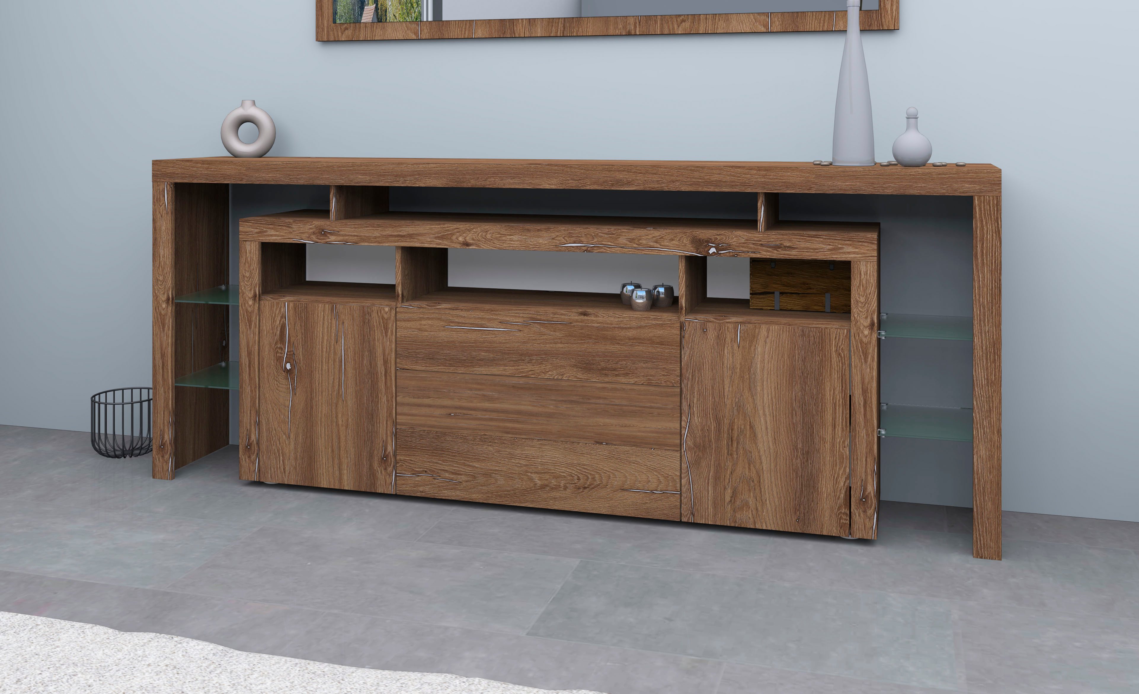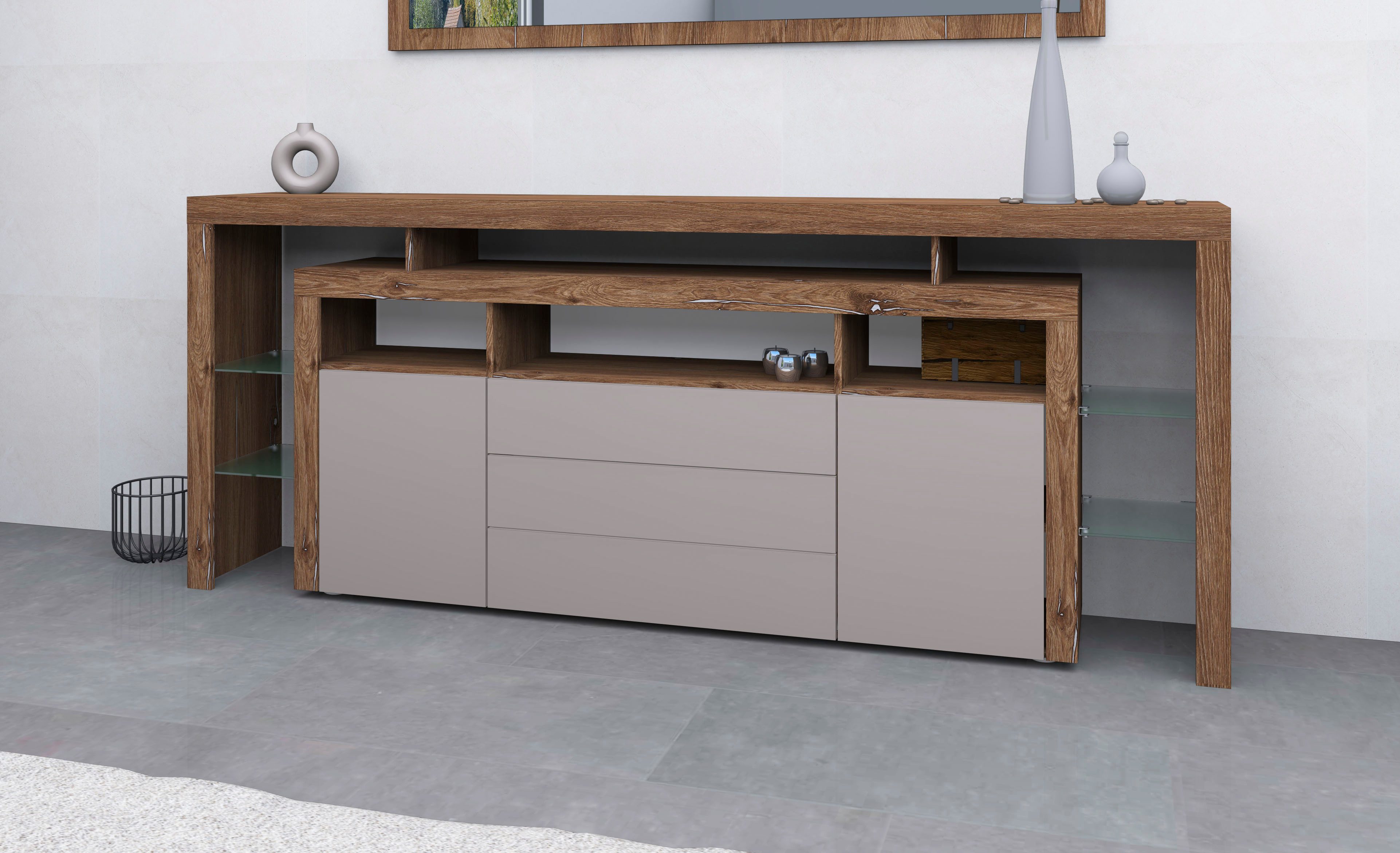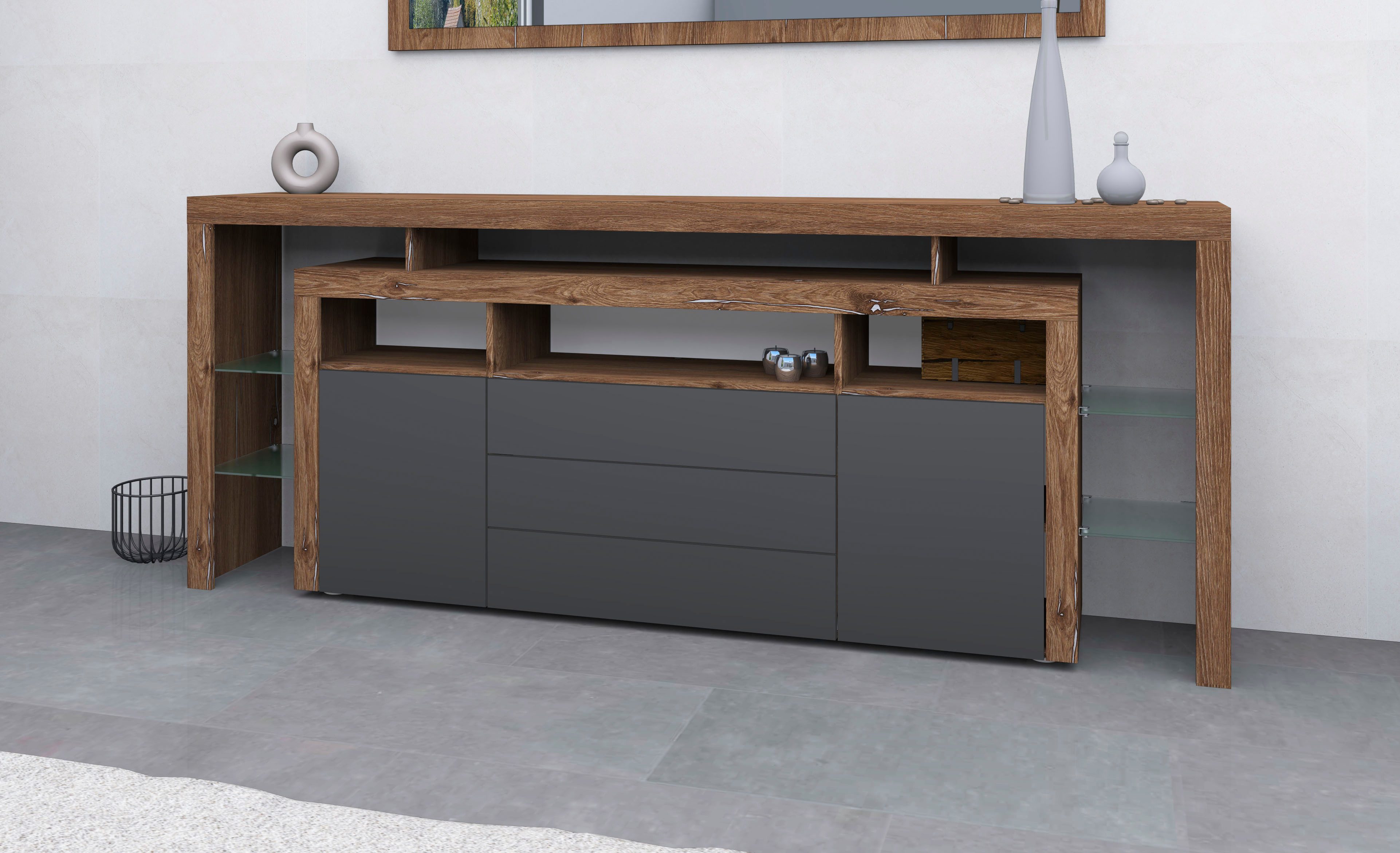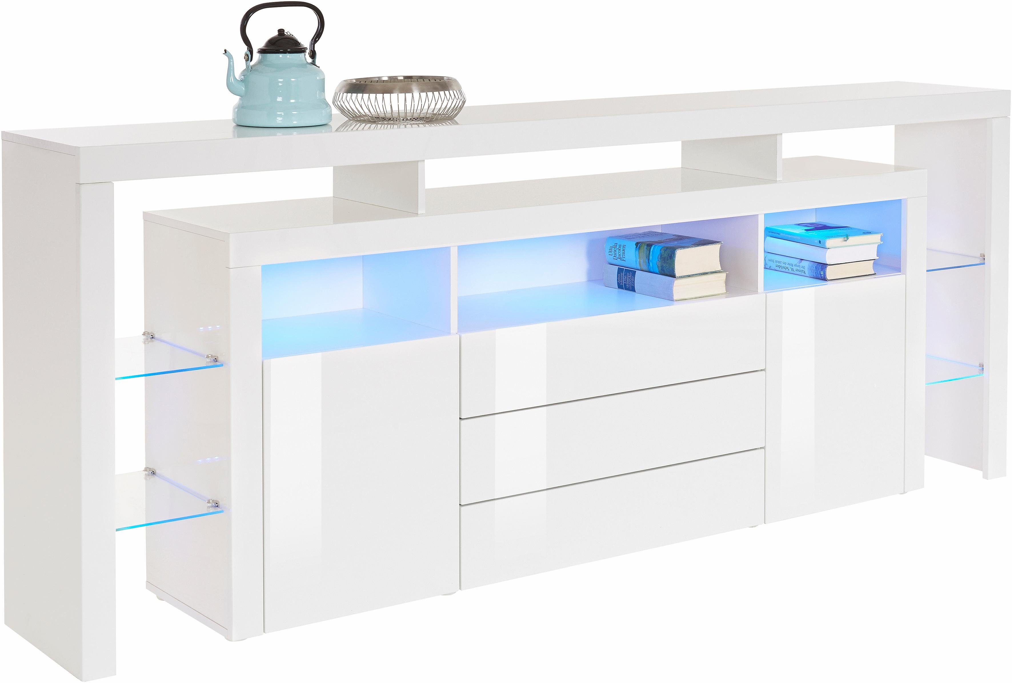 Wissenswertes | Außergewöhnliches Wohnprogramm in modernem Design und extravaganten Farbdekoren! Dieses Sideboard mit Rahmenoptik verfügt über zwei Türen mit Metallscharniere und drei Schubkästen mit Metallkugelauszügen. Hinter den Türen befindet sich je ein verstellbarer Einlegeboden. Darüber hinaus verfügt der Artikel über einen stilvollen Überbau mit festen beleuchtbaren Glasböden, der Ihren Wohnbereich zusätzlich aufwertet. Über den Türen und Schubkästen befinden sich drei offene Fächer. In der weißen und schwarzen Варианты sind die Fronten, Außenseiten und die Oberböden hochglänzend. Die Fronten lassen sich mit der grifflosen innovativen Push-To-Open Technologie öffnen. In folgenden Farben erhältlich: