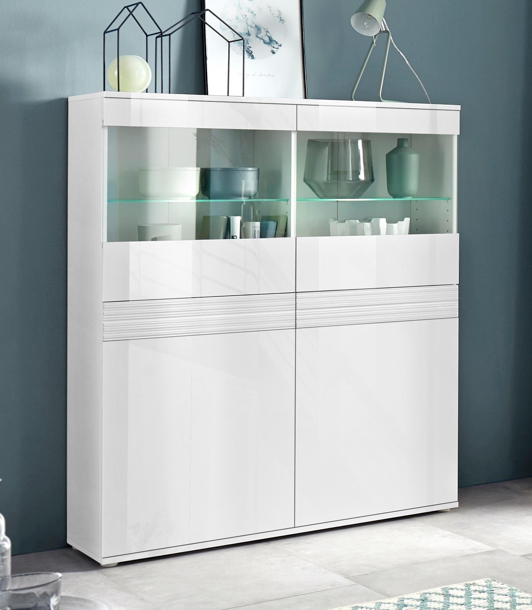 Wissenswertes | Diese elegante Vitrine ist ein echter Hingucker! In tollen Farbdekoren bietet sie viel Platz für Ihre persönlichen Dinge. Die zwei Holz- und Glastüren werden mit Hilfe der Push-To-Open Technik bequem geöffnet. Das Highlight dieser Vitrine stellen die Riffeloptik-Absetzungen in MDF-Hochglanz dar, die bei den beiden Türen zu sehen sind. Die sichtbare weiße Front ist hochglänzend. Die stahlfarbene Front ist matt. Bei den weißen Ausführungen ist der Oberboden und die Außenseiten hochglänzend. In folgenden Farben erhältlich: