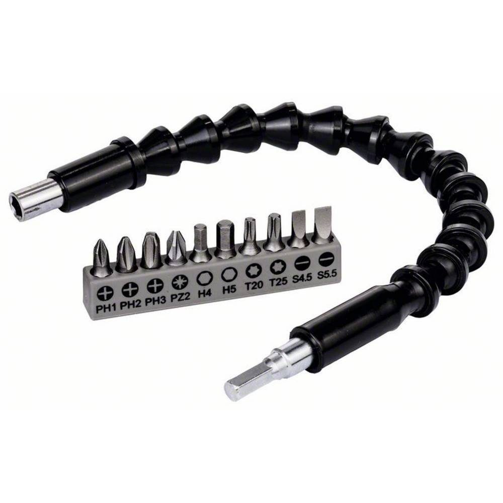 Lieferumfang | Schlitz 4.5/5.5 mm · Kreuzschlitz Phillips PH 1/PH 2/PH 3 · Kreuzschlitz Pozidriv PZ 2 · Innen-Sechskant SW 4/5 mm · Innen-T-Profil T 20/T 25 · Flexible Verlängerung 300 mm. |