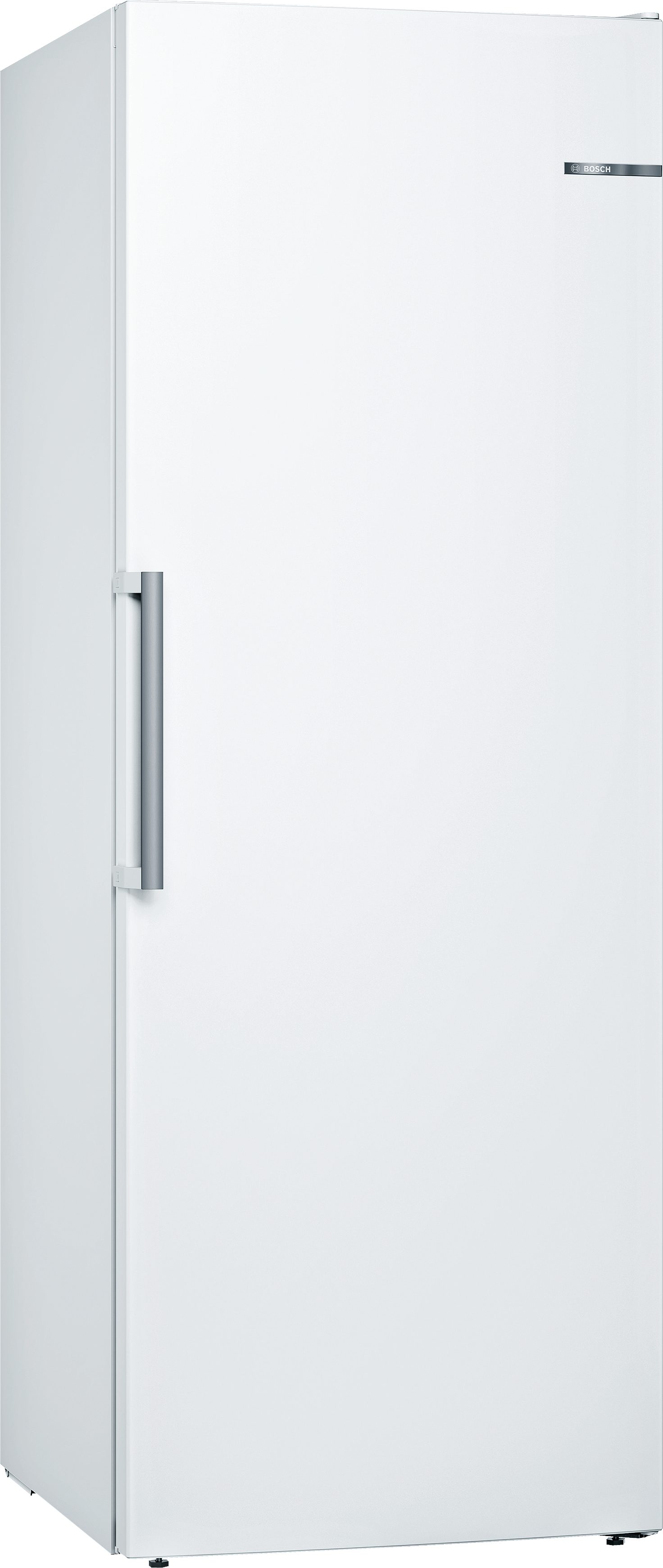Der Gefrierschrank »GSN58DWDV« ist von der Marke BOSCH und freistehend. Das Gerät hat die Maße 70 x 191 x 78 cm (B/H/T). Das Modell arbeitet mit einem Betriebsgeräusch von 38 dB. Regelmäßiges Abtauen ist mit der No Frost-Funktion passé – ein Umluftsystem leitet die Luftfeuchtigkeit aus dem Gefrierraum ab, wodurch das Gerät nie wieder abgetaut werden muss. Das Modell besitzt fünf Gefrierschubladen und drei Gefrierfächer mit Klappe. Die Schnellgefrier-Funktion sorgt dafür, dass sich die Lebensmittel besonders schnell kühlen und einfrieren lassen. Liegt eine Fehlfunktion vor, gibt der Gefrierschrank ein optisches und akustisches Warnsignal. Dank der LED-Innenbeleuchtung findet man außerdem immer schnell, wonach man sucht. Die Möglichkeit der rechts- und linksseitigen Montage ist bei der Tür des Geräts besonders erwähnenswert. Der Gefrierschrank »GSN58DWDV« verfügt darüber hinaus über höhenverstellbare Füße. Der »GSN58DWDV« von BOSCH ist ein Gefrierschrank, der mit seinen Features überzeugt und genug Platz für Lebensmittel aller Art bietet.