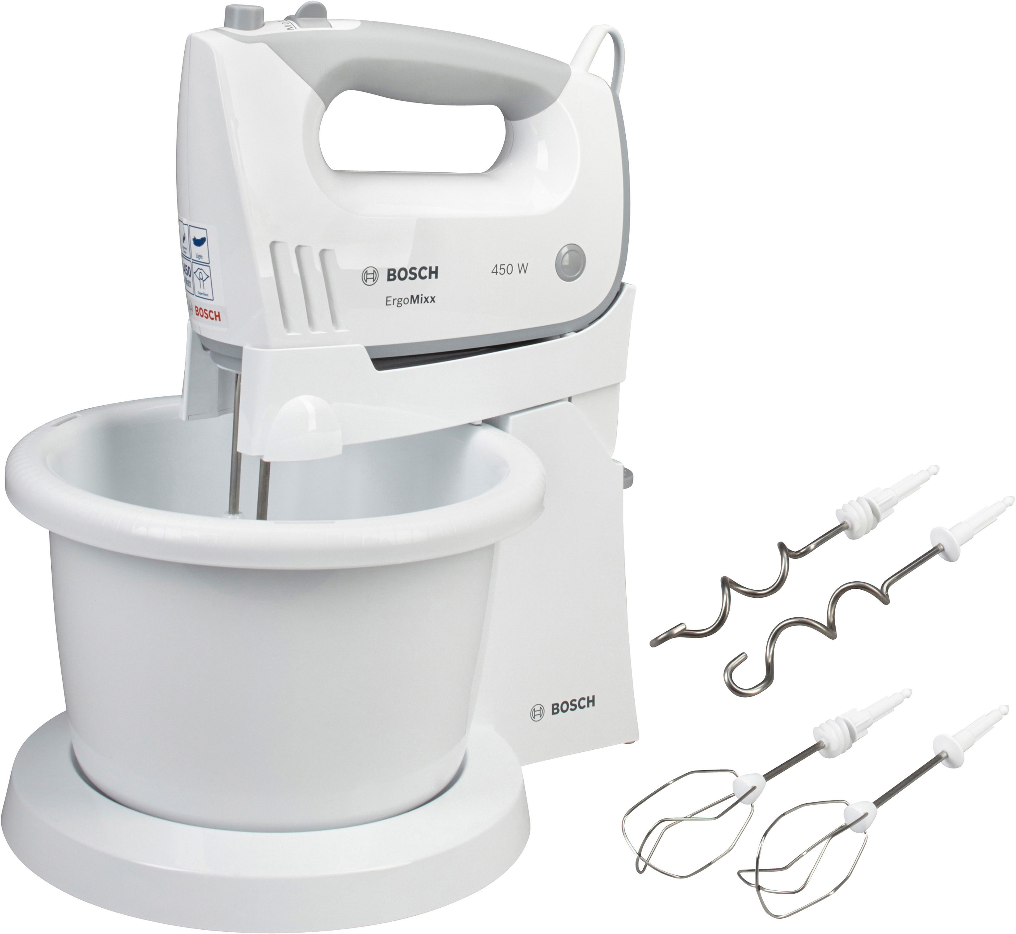 Впередe Vorteile | Anschlussmöglichkeit für Stabmixer-Zubehör. Sekundenschnelles Anschließen und Abnehmen eines Mixfußes durch patentiertes Klicksystem. Komfortables und ermüdungsfreies Arbeiten durch Geräteständer in Verbindung mit einer rotierenden Rührschüssel Maximale Füllmenge der Schüssel: 500 g Mehl + Zutaten (Brot- oder Pizzateig) Moderne Motortechnik: kraftvoll, leise und leicht. Separate Auswurftaste für Rührbesen und Knethaken Zubehör: 2 Rühr/Schlagbesen, 2 Knethaken Edelstahl, Ständer, Kunststoff-Rührschüssel |