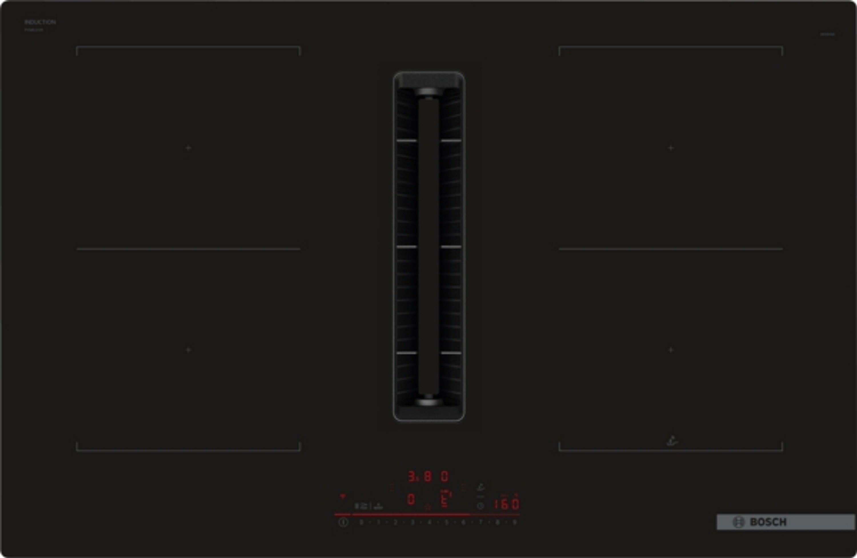 Induktionskochfeld mit vollintegriertem, leistungsstarkem Downdraft-Abzugsmodul.