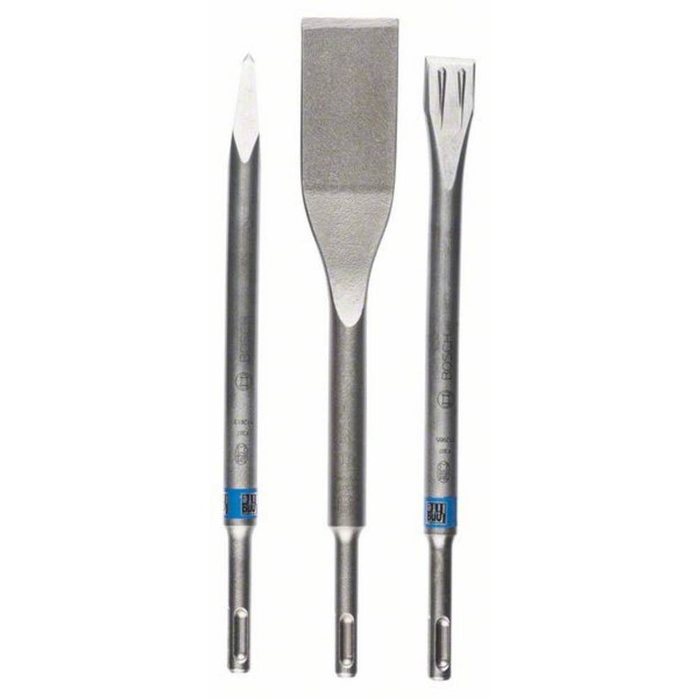 Das dreiteilige Meißelset mit SDS plus für eine Vielfalt von Renovierungs- und Restaurierungsarbeiten in verschiedenem Material besteht aus einem Flachmeißel, einem Spitzmeißel und