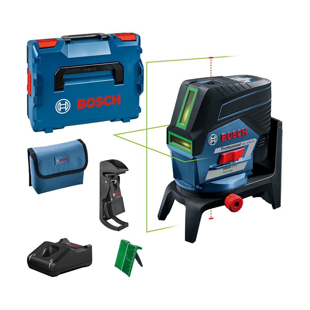 Der Kombilaser GCL 2-50 CG Professional bietet höchste Sichtbarkeit verbunden mit einer Reihe intelligenter Funktionen. Helle grüne horizontale und vertikale Laserlinien und zwei zentrierte Lotpunkte sorgen für optimale Sichtbarkeit, während über die Bluetooth®-Verbindung ein Ausrichten des Werkzeugs per Fernsteuerung über eine Smartphone-App möglich ist. Mehr Flexibilität durch Dual Power Source-Betrieb mit 12-V-Li-Ion-Akku oder Standard-Alkalinebatterien.