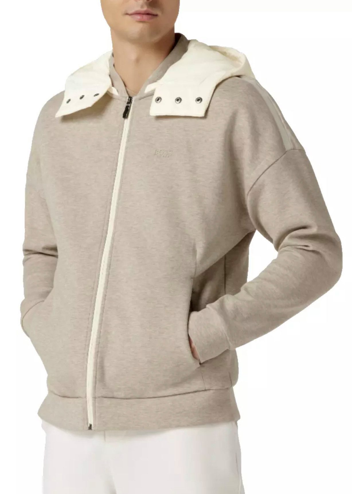 Der BOSS Soowyn Hoodie kombiniert modernen Stil und Funktionalität in einer bequemen Kapuzenjacke. Hergestellt aus einer weichen Baumwollmischung mit Stretch-Anteil, bietet diese Jacke eine gerade Passform und höchsten Tragekomfort. Sie verfügt über eine abnehmbare Kapuze, einen durchgehenden Reißverschluss und praktische Seitentaschen. Die dezenten Kontraststreifen und das charakteristische BOSS-Logo verleihen der Jacke einen sportlich-eleganten Look, der vielseitig kombinierbar ist.