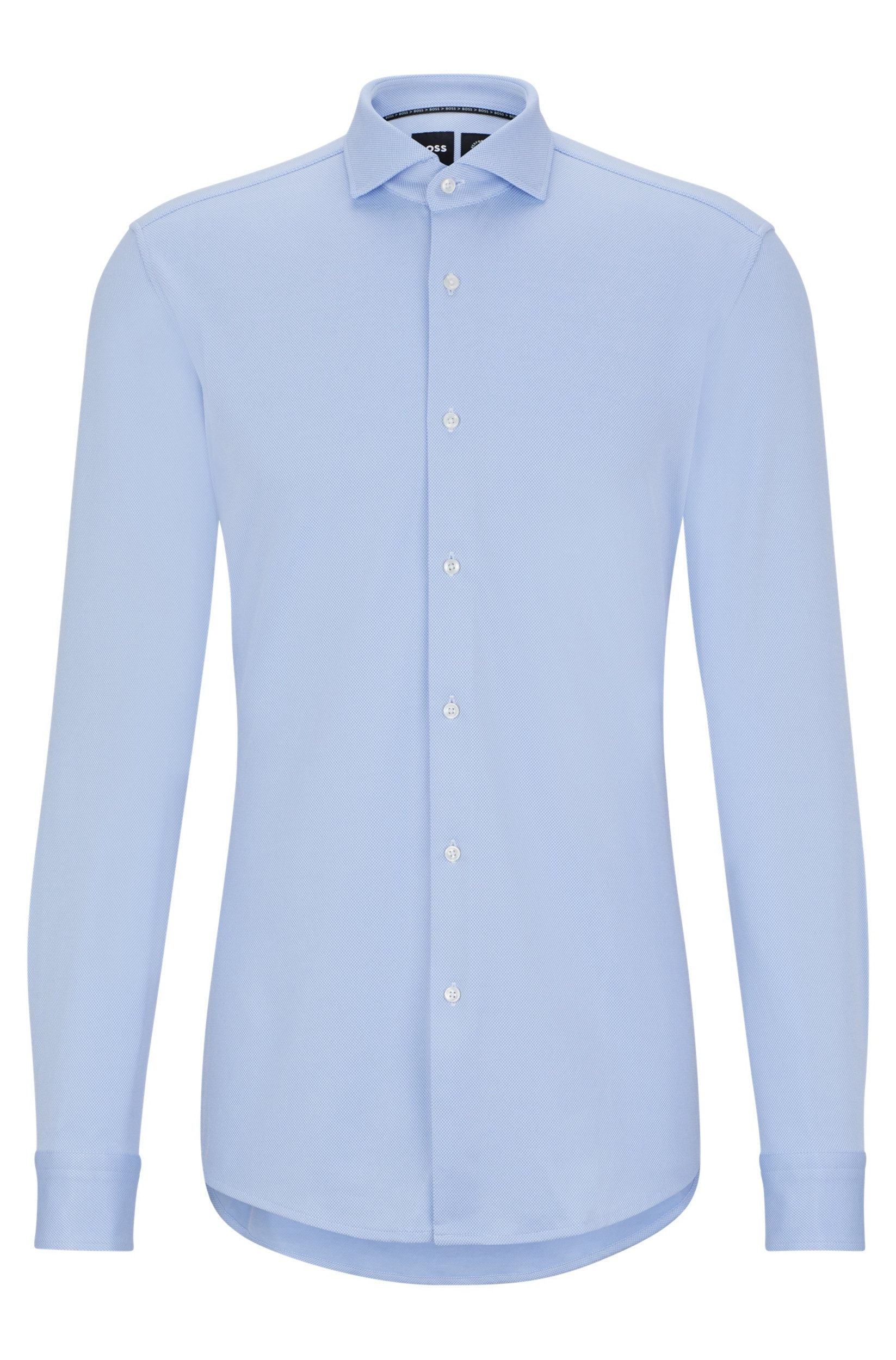 Das strukturierte Slim-Fit Hemd von BOSS ist ein innovatives Business-Hemd, das mit seinem schmalen Schnitt und funktionalen Eigenschaften überzeugt. Das Hemd ist aus einem Baumwoll-Mix mit Jersey-Finish gefertigt, was ihm eine strukturierte Optik verleiht und gleichzeitig für optimale Bewegungsfreiheit sorgt. Dies macht das Hemd besonders komfortabel und flexibel.Die zeitgemäße Silhouette des Hemds sorgt für eine moderne und ansprechende Optik. Der Cutaway-Kragen verleiht dem Hemd einen eleganten Look und ist vielseitig kombinierbar.Ein besonderes Detail sind die kontrastfarbenen Paspeln innen am Kragen. Diese subtilen Akzente zeigen die Liebe zum Detail, die BOSS auszeichnet und verleihen dem Hemd eine individuelle Note.Die abgerundeten Manschetten geben dem Hemd einen eleganten Touch und komplettieren das Gesamtbild des Slim-Fit Hemds.Das strukturierte Slim-Fit Hemd eignet sich perfekt für formelle Anlässe, bei denen Sie einen professionellen und ansprechenden Auftritt hinlegen möchten. Dank des funktionalen Stretch-Jerseys ist es nicht nur bequem, sondern auch strapazierfähig und knitterarm. Es vereint somit Stil und Komfort in einem Hemd, das Ihnen ein selbstbewusstes Auftreten ermöglicht.