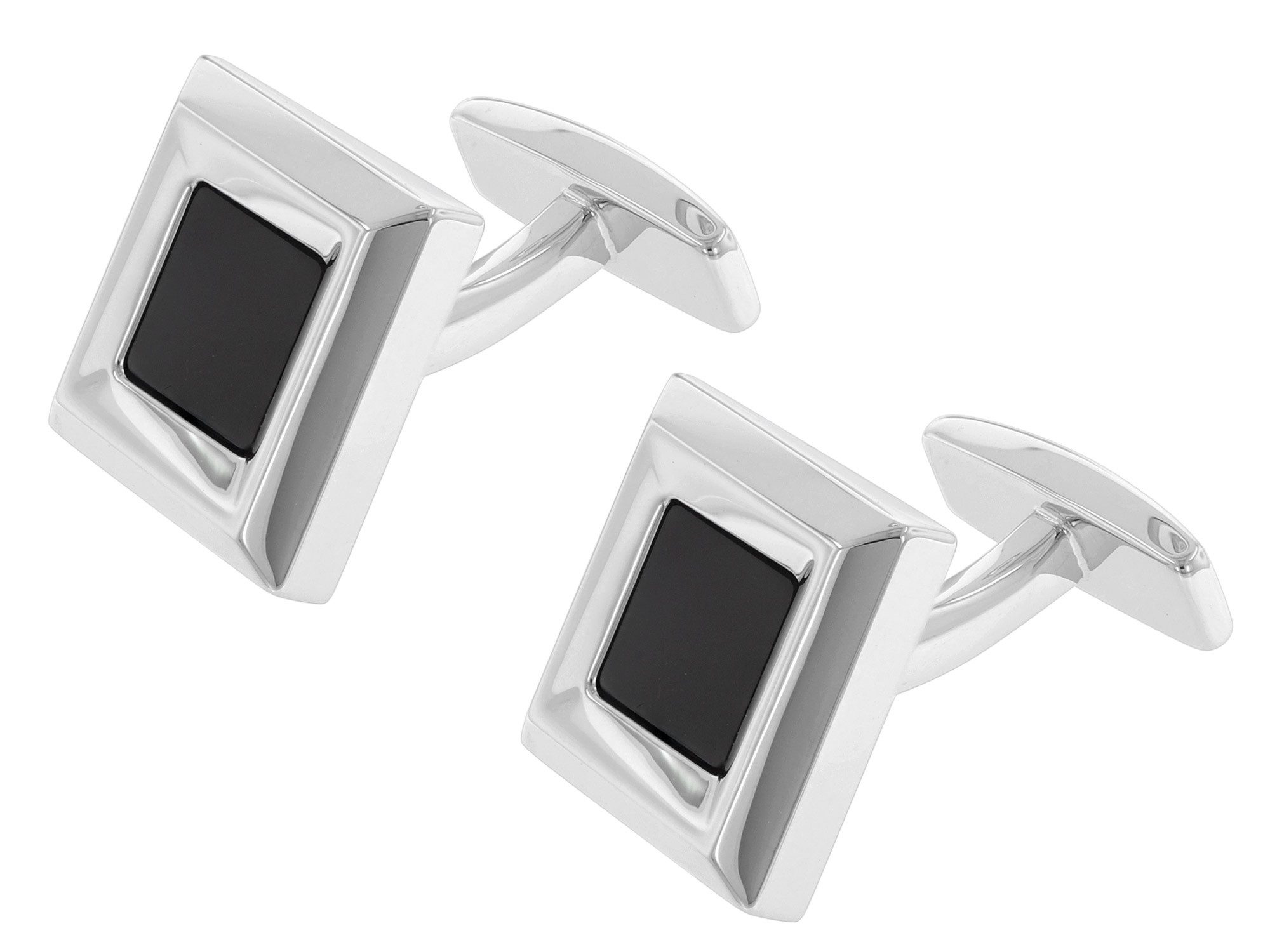 markante silberfarbene Manschettenknöpfe, hochglanzpoliert, quadratisch, schwarzer Emaille-Einsatz, Размер 16 x 16 mm, Höhe 4,5 mm, feststehender Verschluss, graviertes BOSS Logo auf dem Bügel