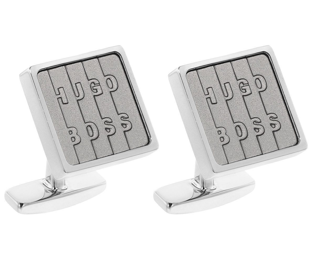 moderne polierte Manschettenknöpfe aus Messing, silberfarben, quadratisch, pastellgraues Inlay mit 3-D-Streifenmuster und Logo-Schriftzug, Размер 16 x 16 mm, feststehender Verschluss, eingraviertes Logo
