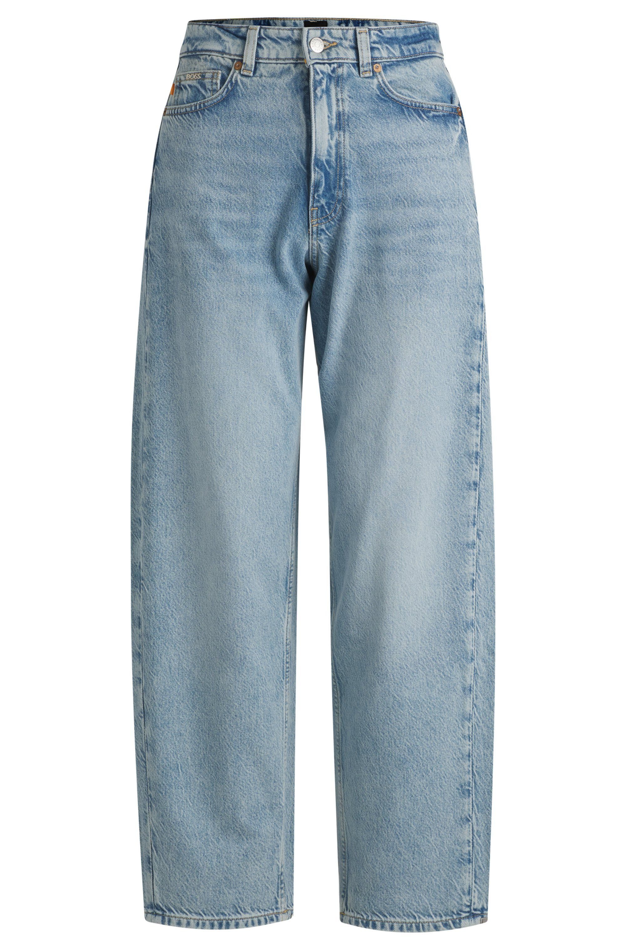Hellblaue BOSS Jeans mit Ballon-Silhouette. Die vielseitig kombinierbare Hose aus festem Denim verspricht hohen Tragekomfort und ein leichtes Tragegefühl. Die Rohstoffe dieses Produkts stammen aus der regenerativen Landwirtschaft: Der Ansatz zur Erhaltung und zum Wiederaufbau soll die Biodiversität steigern, die Wasserqualität schützen und die Regeneration des Mutterbodens durch Aufnahme von CO₂ verbessern. Regenerative Landwirtschaft setzt sich auch für das Tierwohl und faire Arbeitsbedingungen der Bauern ein.